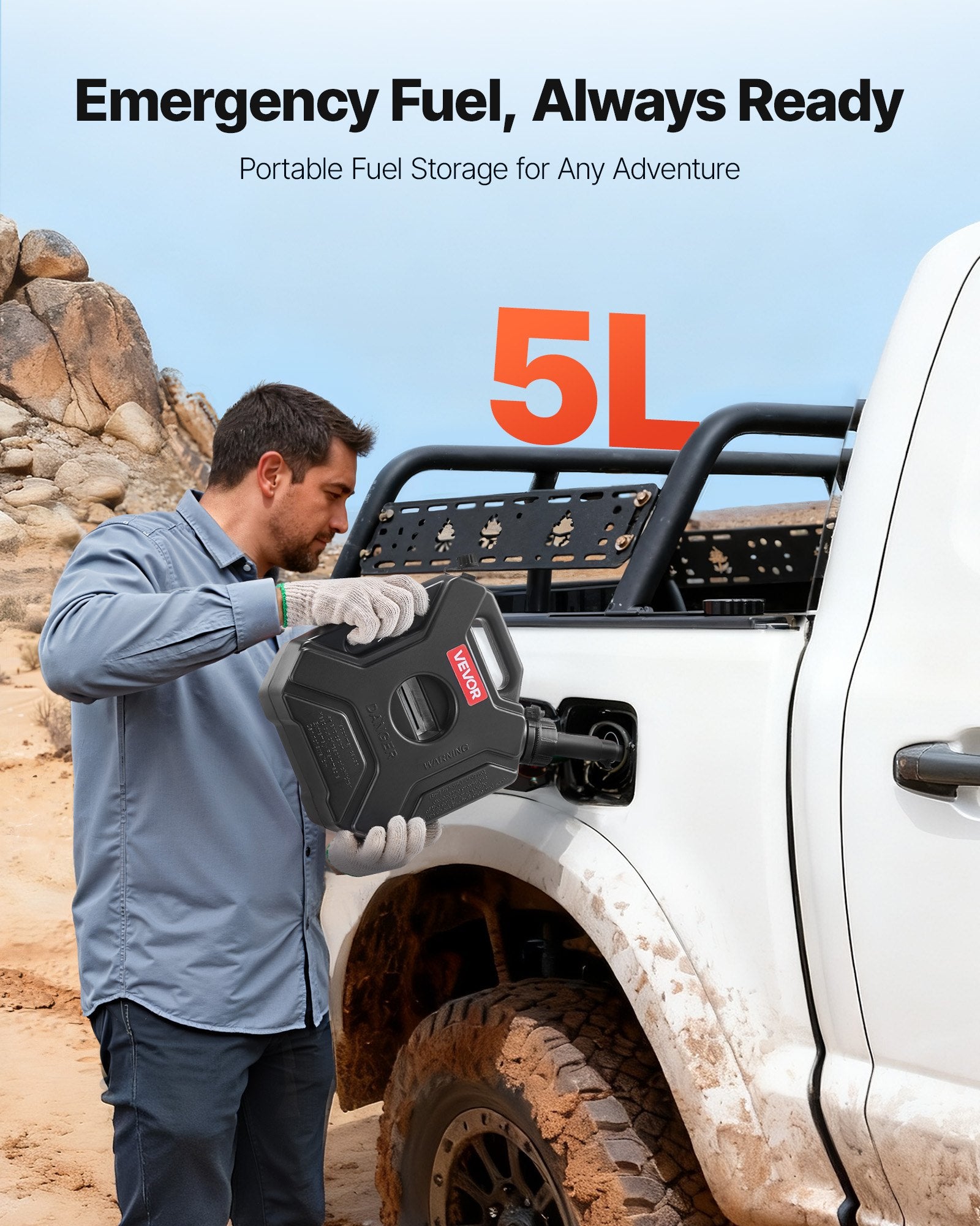 - Kompakt storlek: Behöver du reservbränsle utan att förlora bagageutrymme? Denna 5-liters bränslebehållare glider direkt in! Den är lätt, bärbar och redo för bilresor, camping eller utomhusarbete.