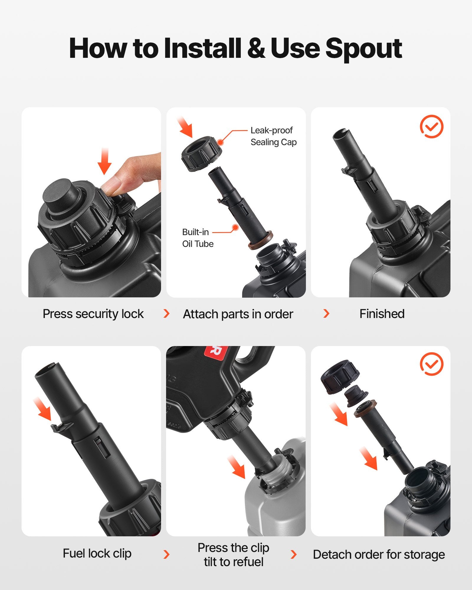 - Säker mot lossning: Orolig för läckage på guppiga vägar? Oroa dig inte! Denna bensindunk har ett läckagesäkert lock, växelklämma och inbyggt rör som håller den tät varje gång.