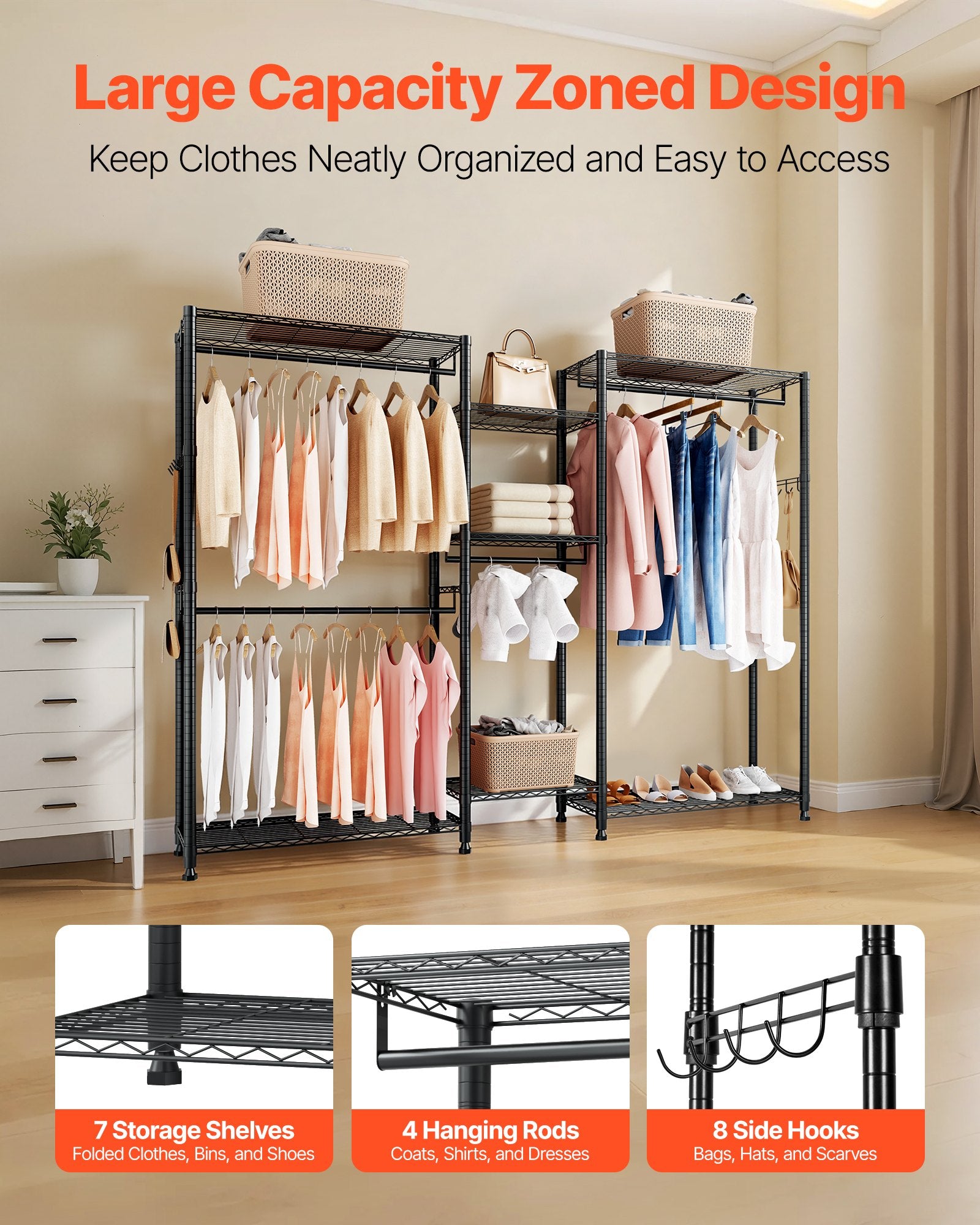 Klädställ, Kraftig garderob, 7 justerbara klädställningar med stålram, 385,5 kg lastkapacitet klädställ med 4 upphängningsstänger för sovrum, klädaffär, hall
