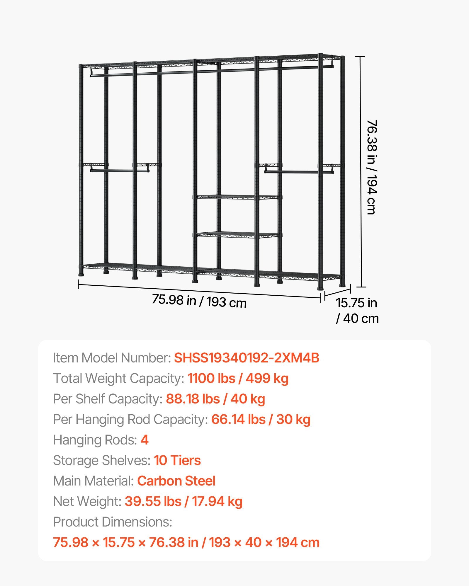 - Robust konstruktion: Tillverkad av förtjockat kolstål, stöder denna klädställning upp till 499 kg och hanterar vikten av olika kläder och accessoarer. Den rost- och korrosionsbeständiga pulverlackerade ytan skyddar mot dagliga repor och slitage.