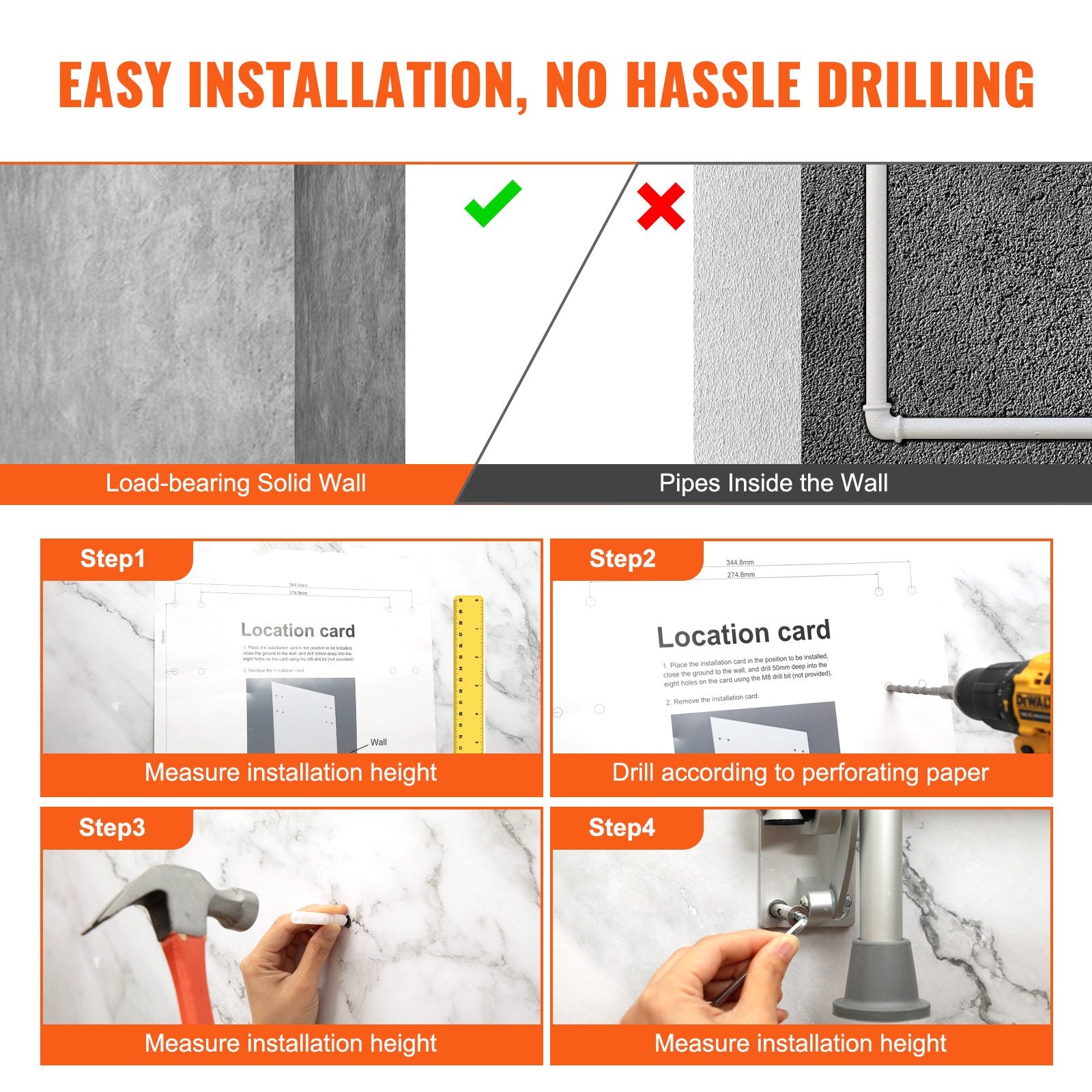 - Väggmontering med borrhål: Noggrant utrustad med monteringshålsguide för exakt borrning – inga ytterligare markeringar med penna behövs. Komplett med skruvar i 304 rostfritt stål och andra tillbehör, vilket garanterar säker montering. Obs: Montera vår hopfällbara duschsits på bärande massiva väggar.