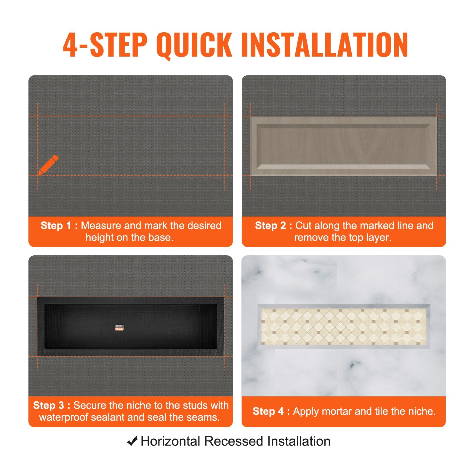 - Enkel installation: Utrustad med ett kostnadsfritt installationskit, horisontellt inbäddad installation, behöver du bara följa följande steg för att slutföra. Dessa duschnischhyllor kan installeras utan komplicerade procedurer.