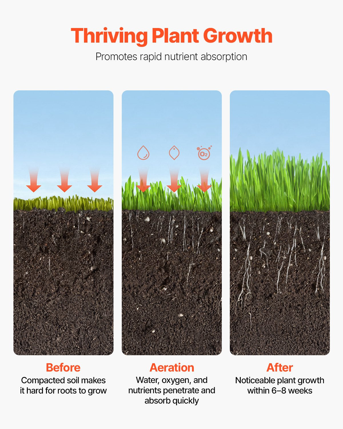 - Promotes Plant Growth: This manual rolling aerator lawn improves soil structure by creating holes that deliver more water and oxygen to plants, avoiding yellowing or decay caused by oxygen and water deficiency. Within 6-8 weeks, you’ll see noticeable growth in your plants.
