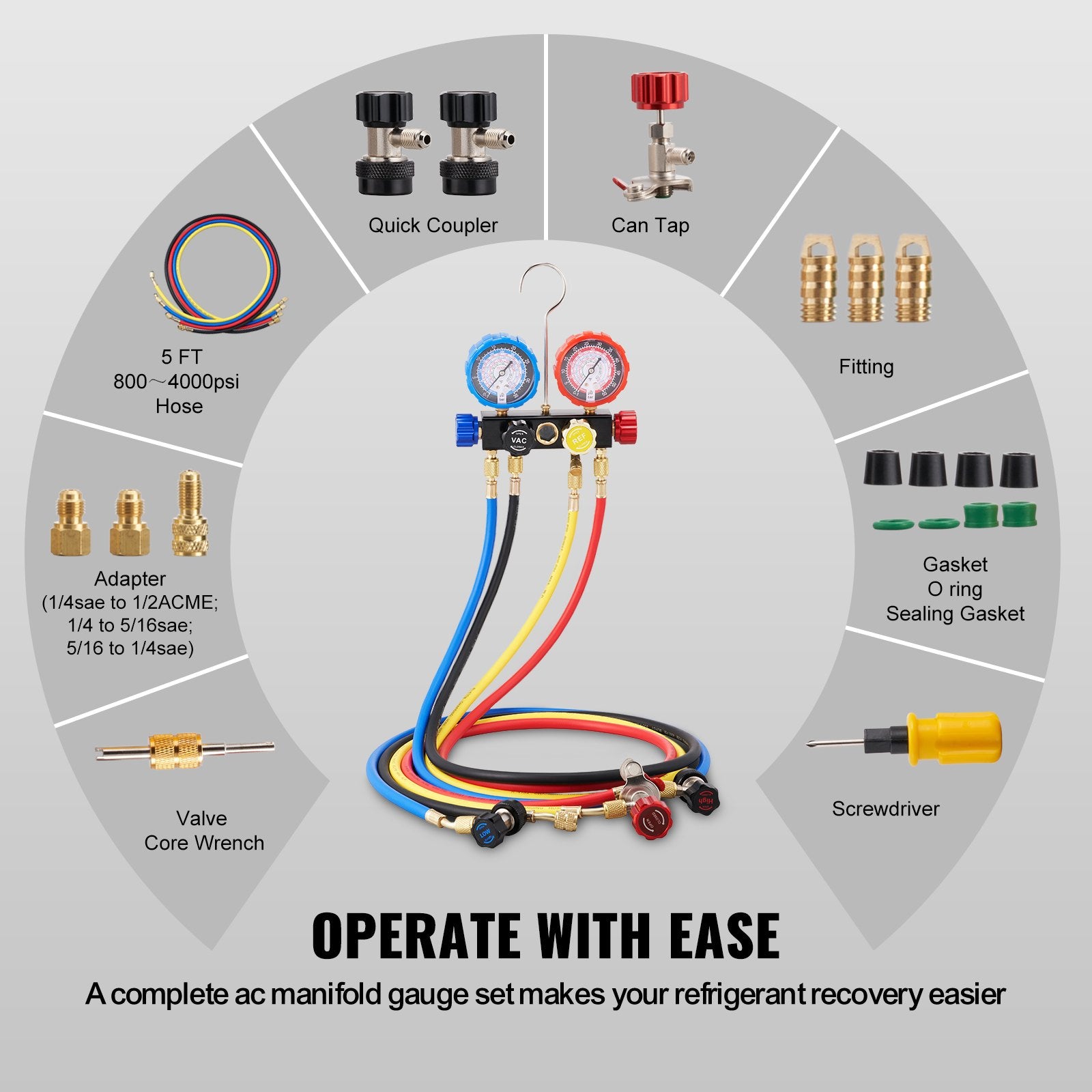 4-vägs AC-mätare - AC-grenrörsmätare för R134A R22 R12 R410A köldmedium, freonmätare med 152,4 cm slangar, kopplingar, burkkran, fungerar på bil, freonpåfyllning och evakuering