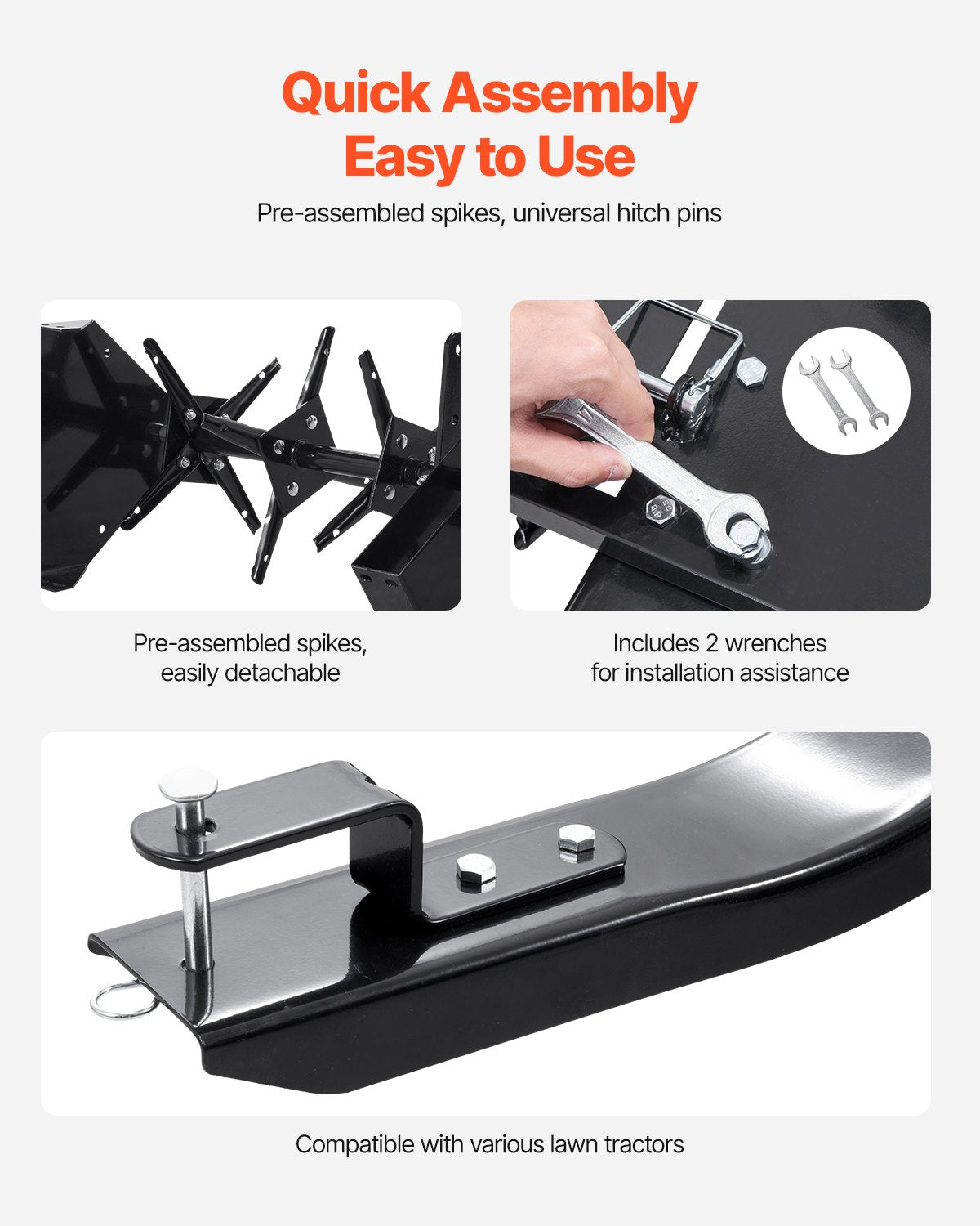 - Quick Installation: Our lawn aerator tow behind comes with pre-installed spikes and includes 2 wrenches for easy setup. You can start using it right away upon delivery. The package also includes a detailed manual for clear instructions and security tips.