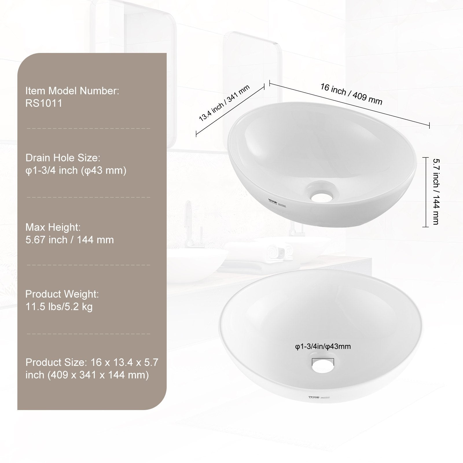 Ovalt handfat, 40 cm x 33 cm, badrumshandfat med bänkskiva, vita keramiska handfat ovanför bänkskivan, modernt handfat, välförpackat för badrum, hotell, toalett, husbil