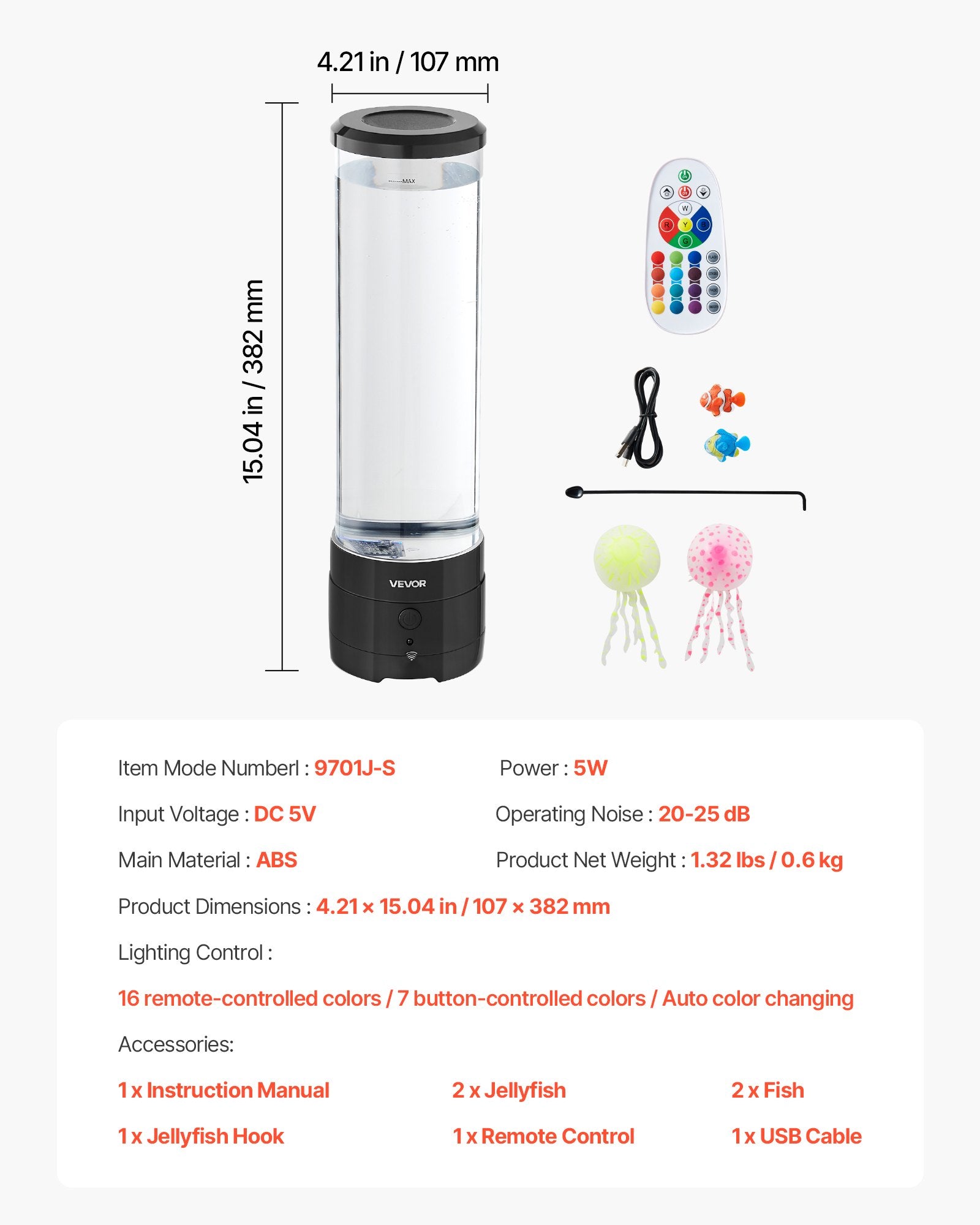- 16 färgalternativ: Med 16 färgval via fjärrkontrollen eller 7 färger på enhetens knapp, och automatiska färgbyten, ger denna bubbelfisklampa visuell magi! Maneterna och fiskarna rör sig synkroniserat med färgerna för en lugnande upplevelse.