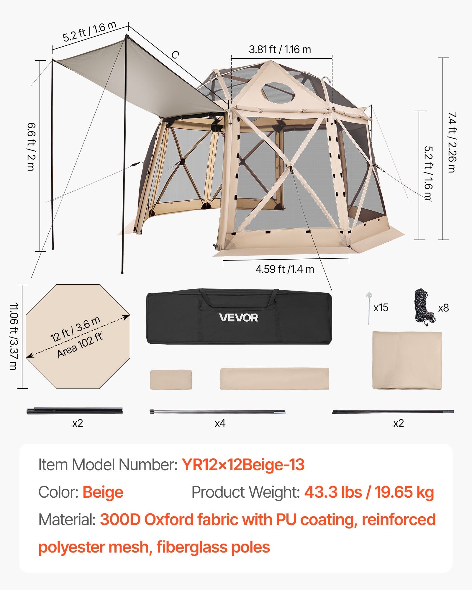 Pop up Gazebo Screen Tent, 3.6x3.6 m, 13-Sided Spherical Camping Canopy Tent with Removable Top & Carry Bag, Quick-Set & Bite-Proof, Screen House Sun Shelter for 8-10 Persons, Beige
