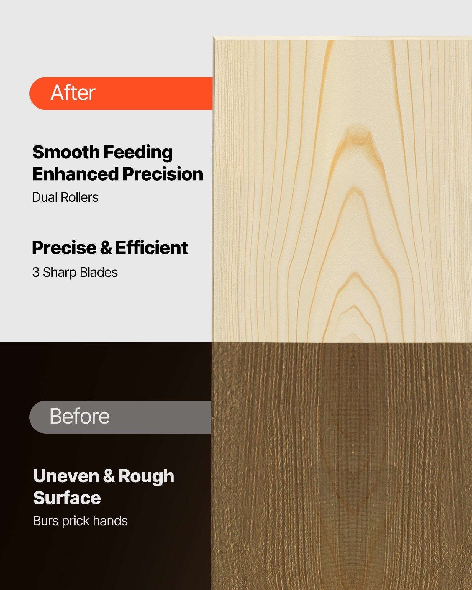 - Dual-Roller Feeding System: Sturdy dual rollers advance boards with precision, reducing vibration and alignment issues for flawlessly straight cuts. Paired with three sharp HSS blades, this thickness planer delivers glass-smooth edges free of splinters