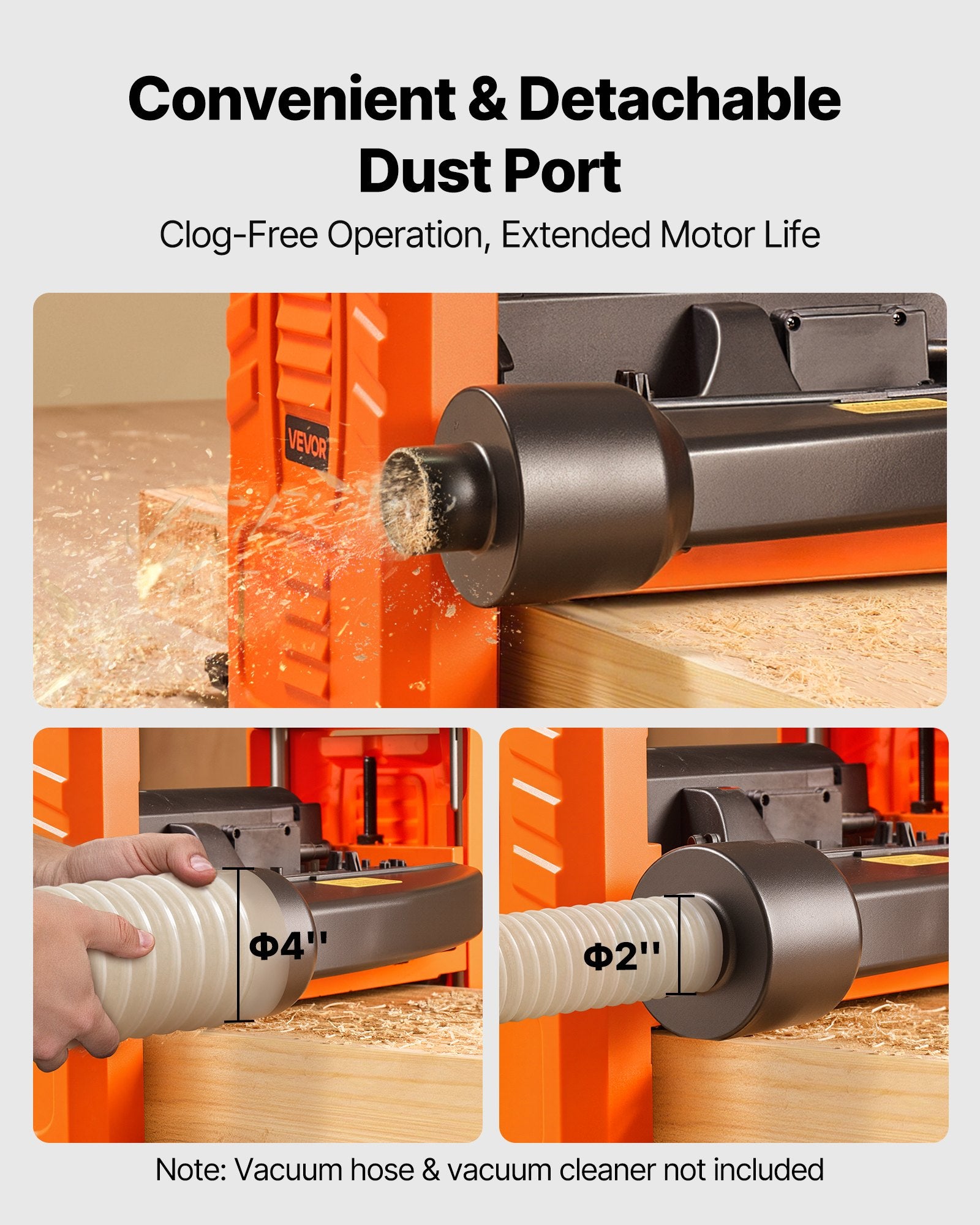 - 2 in & 4 in Dust Hose Compatible: Compatible with both 2-inch and 4-inch dust hoses, the wood benchtop planer efficiently channels wood chips away, keeping your workspace clean and minimizing airborne dust for a comfortable working environment