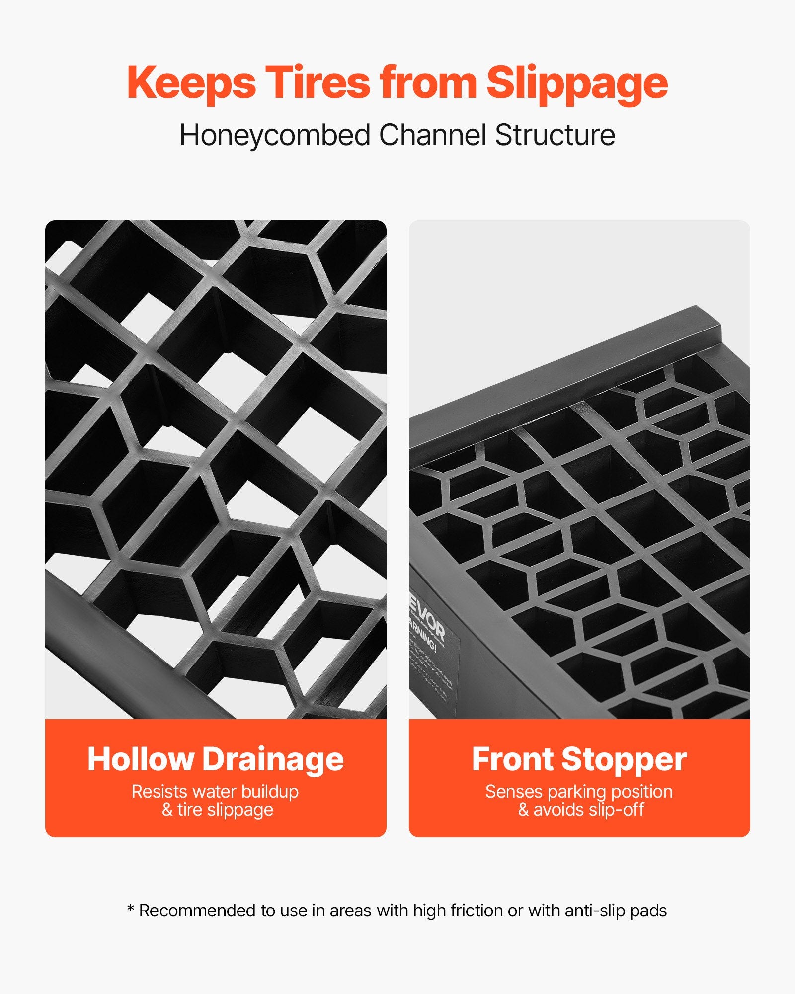 - Specialdesign: Våra oljebytesramper har en bikakeformad yta för att öka friktionen och förbättra dräneringen, vilket minskar fuktuppbyggnad och däckslirning. Den böjda formen passar däcket ordentligt och håller fordonet stabilt och fixerat på plats.