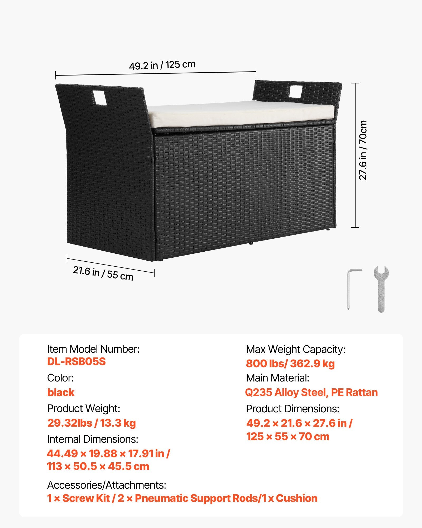 - Förvarings- och sittkombination: Med innermått på 120×50×26 cm rymmer denna 2-i-1-bänk för utomhusbruk bekvämt två personer och erbjuder gott om förvaringsutrymme för olika föremål. Den har en pneumatisk stödstång för enkel och säker åtkomst, vilket förhindrar klämskador på fingrarna. Sidohandtaget gör den enkel att flytta runt.