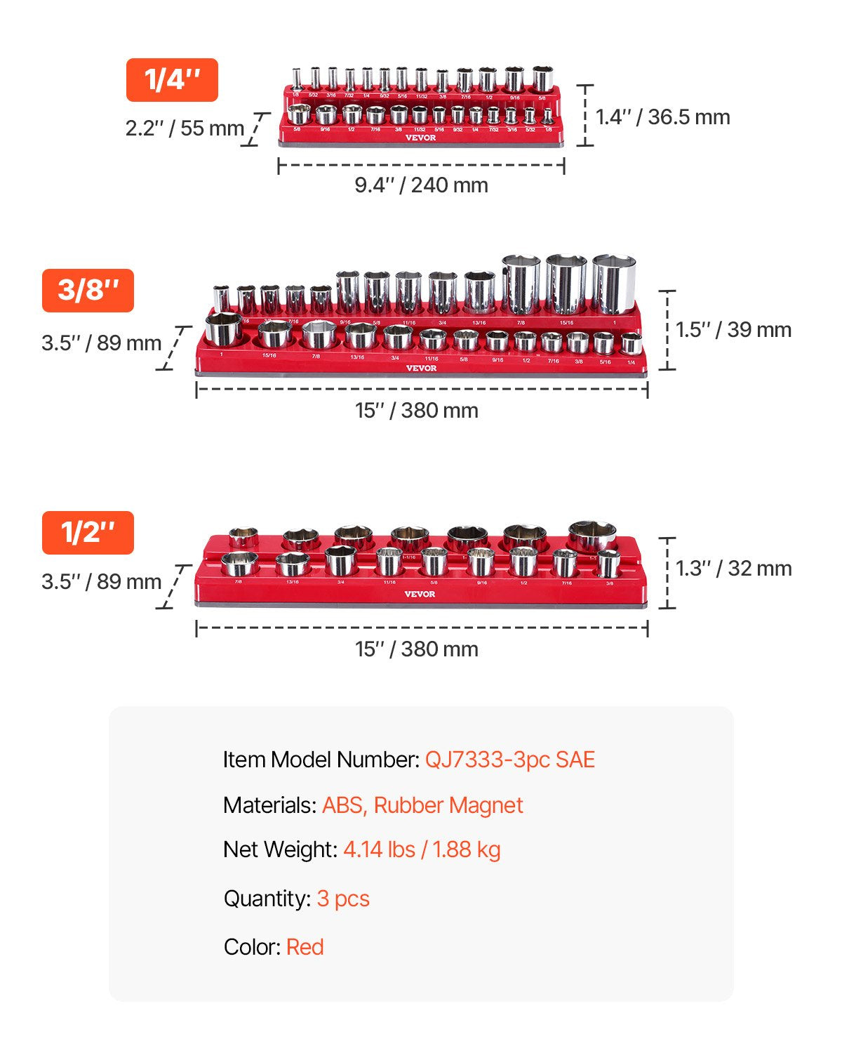 - High Compatibility: Designed to be compatible with multiple socket brands, VEVOR 3PCS magnetic socket organizer set holds up to 68pcs SAE standard and deep sockets, simplifying sockets management, keeping the workspace clean and ensuring you won't lose any sockets. Note: Sockets are not included.