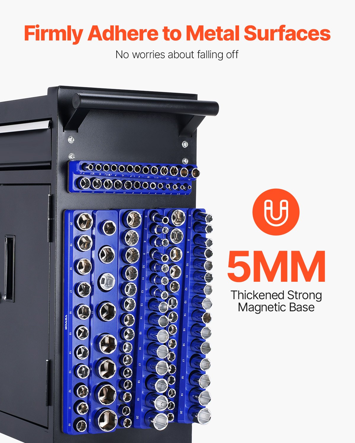 - Stark magnetisk bas: Med en robust 5 mm tjock magnetisk bas bestående av ferrit och CPE, ger våra hylshållare för verktygslådor stark och stabil infästning på metallytor, vilket håller hylshållarna ordentligt på plats utan att glida.
