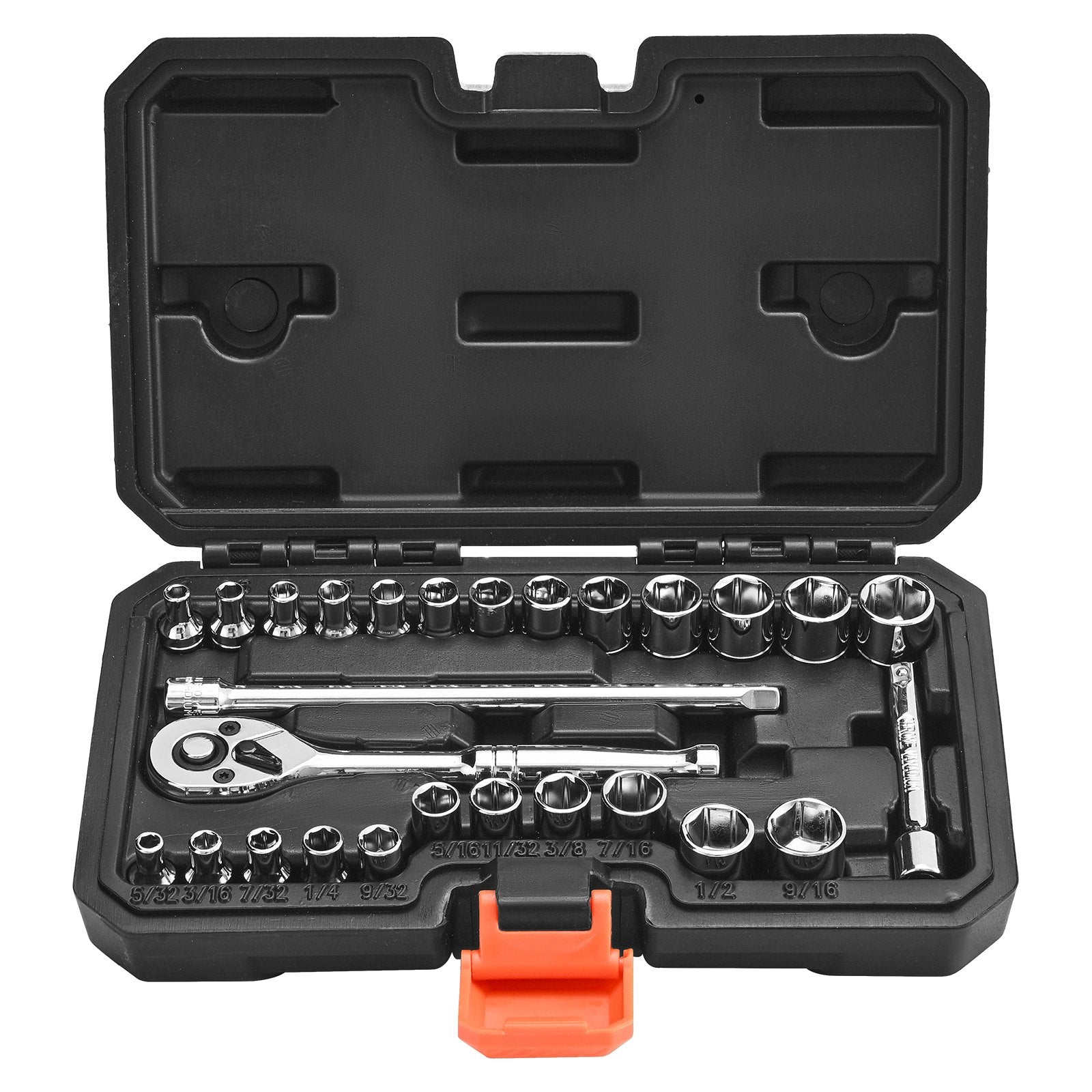 Hylsnyckelsats, 27 delar, hylsnyckelsats med 6,4 mm fäste, SAE och metrisk, mekanisk verktygssats med spärrnyckel, förlängningsstång och förvaringsväska, CR-V legerat stål, för bilreparationer