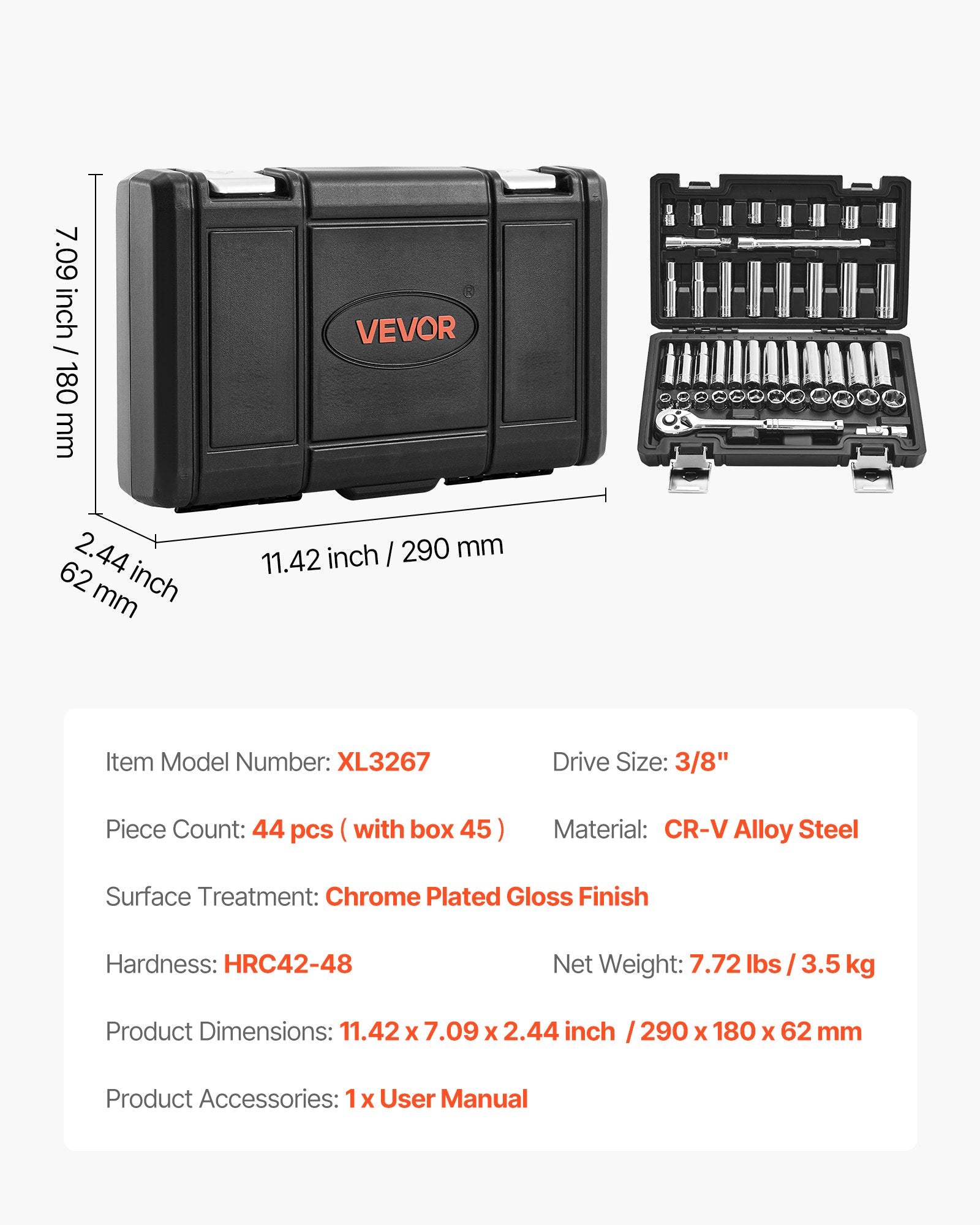 Hylsnyckelsats, 44 delar, 9,5 mm hylsnyckel- och spärrhakesats, SAE och metrisk, djup och grund, mekanisk verktygssats med tillbehör och förvaringsväska, CR-V legerat stål, för bilreparationer