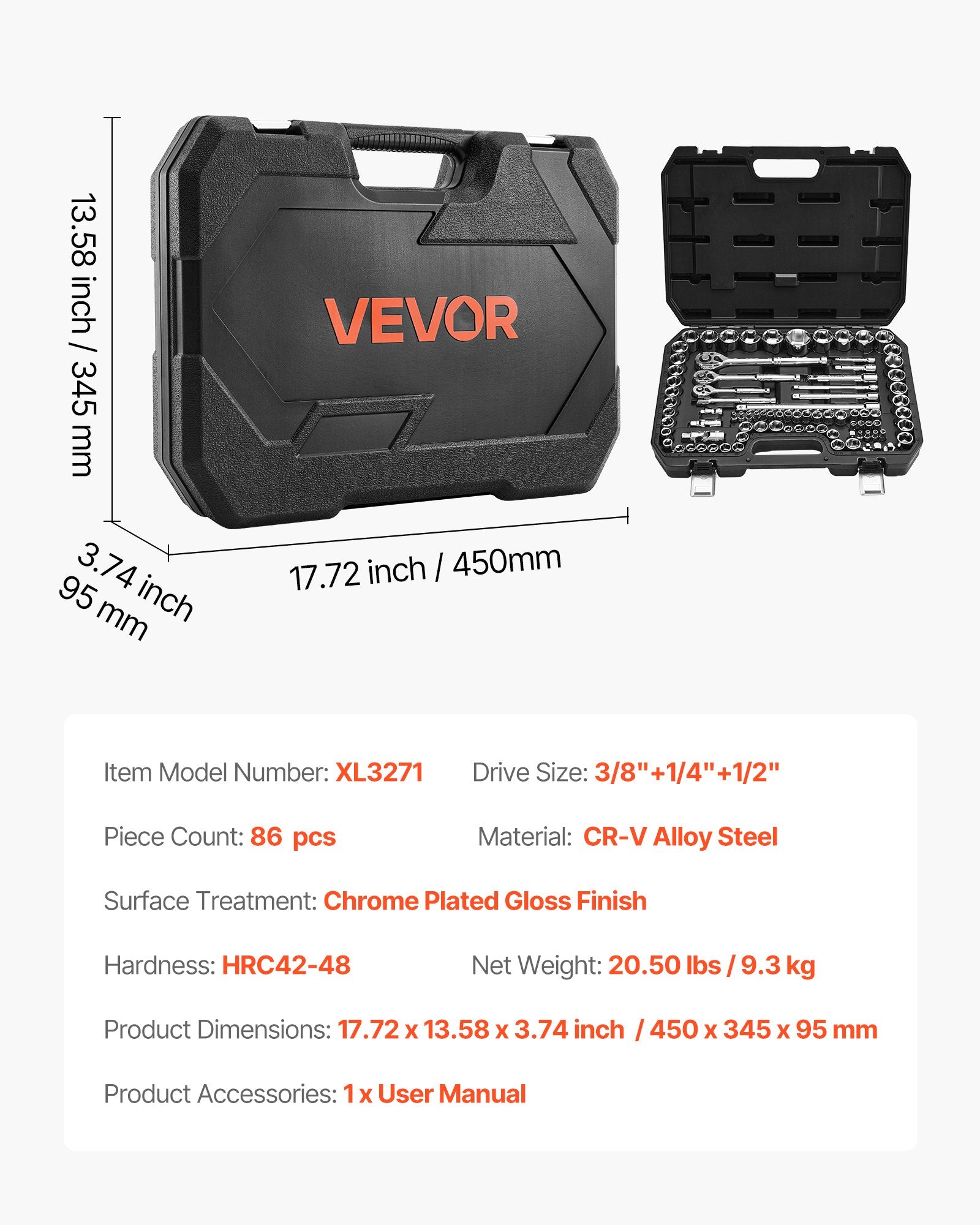 Hylsnyckelsats, 86 delar, 9,5 & 6,4 & 12,7 mm hylsnyckel- och spärrnyckelsats, SAE och metrisk, mekanisk verktygssats med spärrnyckel, tillbehör och förvaringsväska, CR-V legerat stål, för bilreparationer