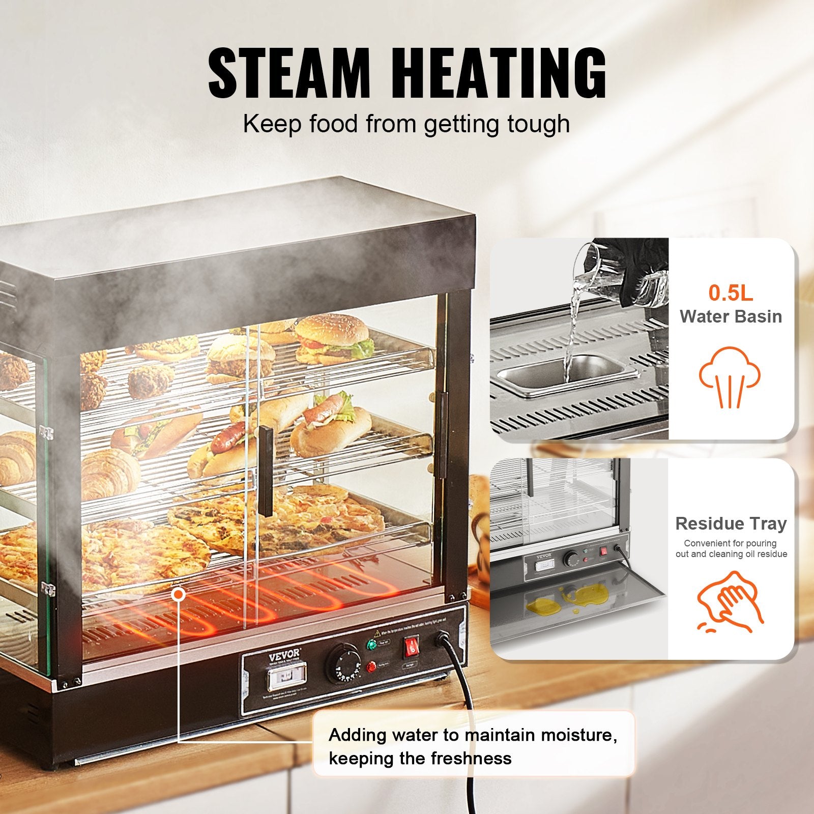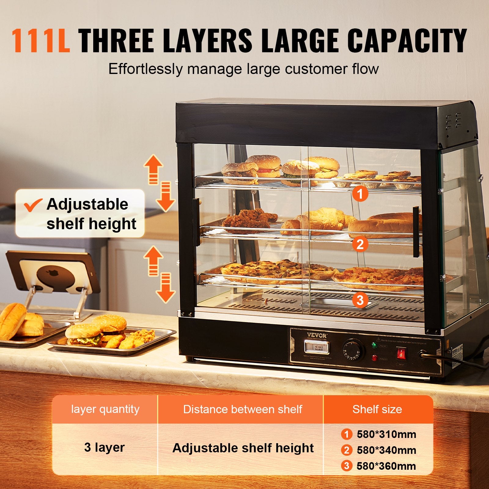 3-vånings kommersiell matvärmare, 1200W matvärmare med belysning, justerbar hylla och temperaturdisplay, 30℃~85℃ ångvärmning, 111L för hamburgare, pizza, bröd, stekt kyckling