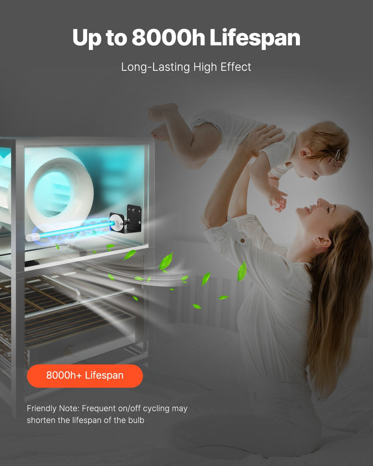 - Effektiv luftrening: HVAC-kanalrenaren använder en 25 W UVC-lampa som avger ultraviolett ljus med en våglängd på 254 nm för att effektivt utplåna de flesta skadliga ämnen från HVAC-kanalytor, vilket förbättrar luftkvaliteten och skapar en ren och hälsosam livsmiljö. EPA Est. No. 94721-CHN-1