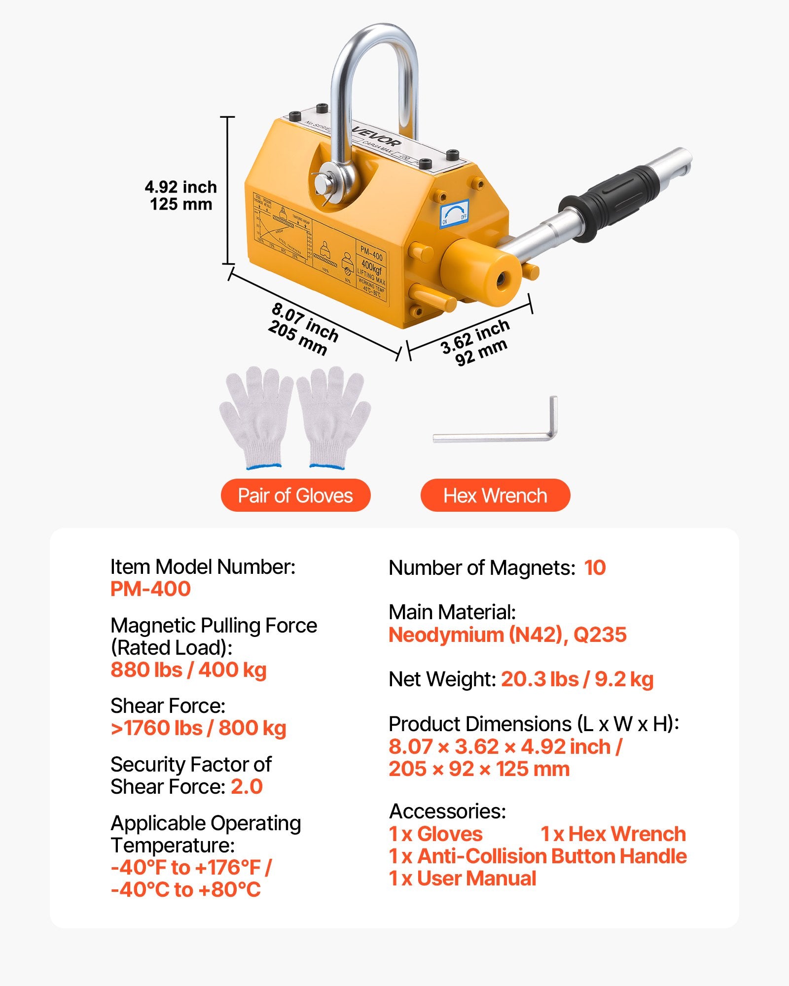- Kraftfull magnetisk kraft: Den permanentmagnetiska lyftaren levererar upp till 400 kg magnetisk kraft med en säkerhetsfaktor på 2,0. Den har en högkvalitativ N42 neodymmagnet för stabil och kraftfull lyftprestanda.