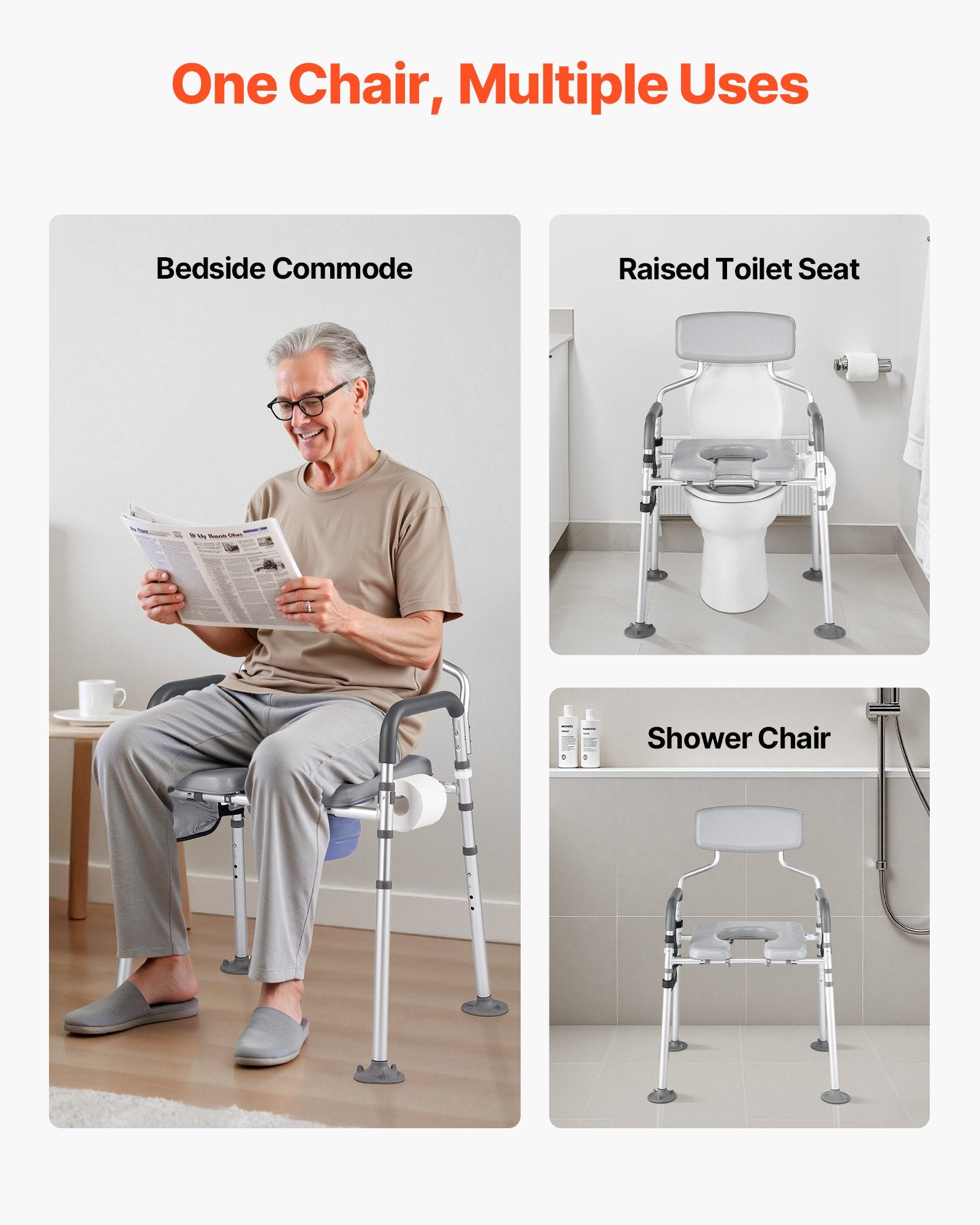 - 4-in-1 Toilet Commode: Built with a reinforced aluminum alloy frame, our commode supports up to 500 lbs. Use it as a bedside commode, raised toilet seat, toilet security frame, or shower chair—one reliable solution for all your in-home care needs
