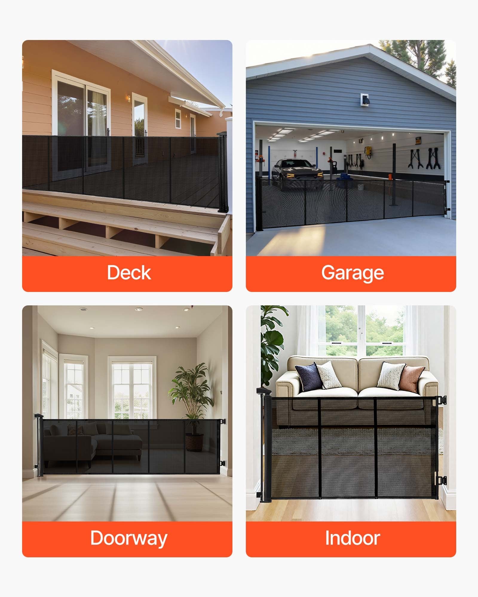- Säker separation utan att blockera sikten: Den infällbara grinden är tillverkad av höghållfast PVC-nät av babykvalitet som är mjukt vid beröring, andningsbart och genomskinligt, så att du kan övervaka ditt barn eller husdjur på avstånd samtidigt som du skapar en säker barriär.