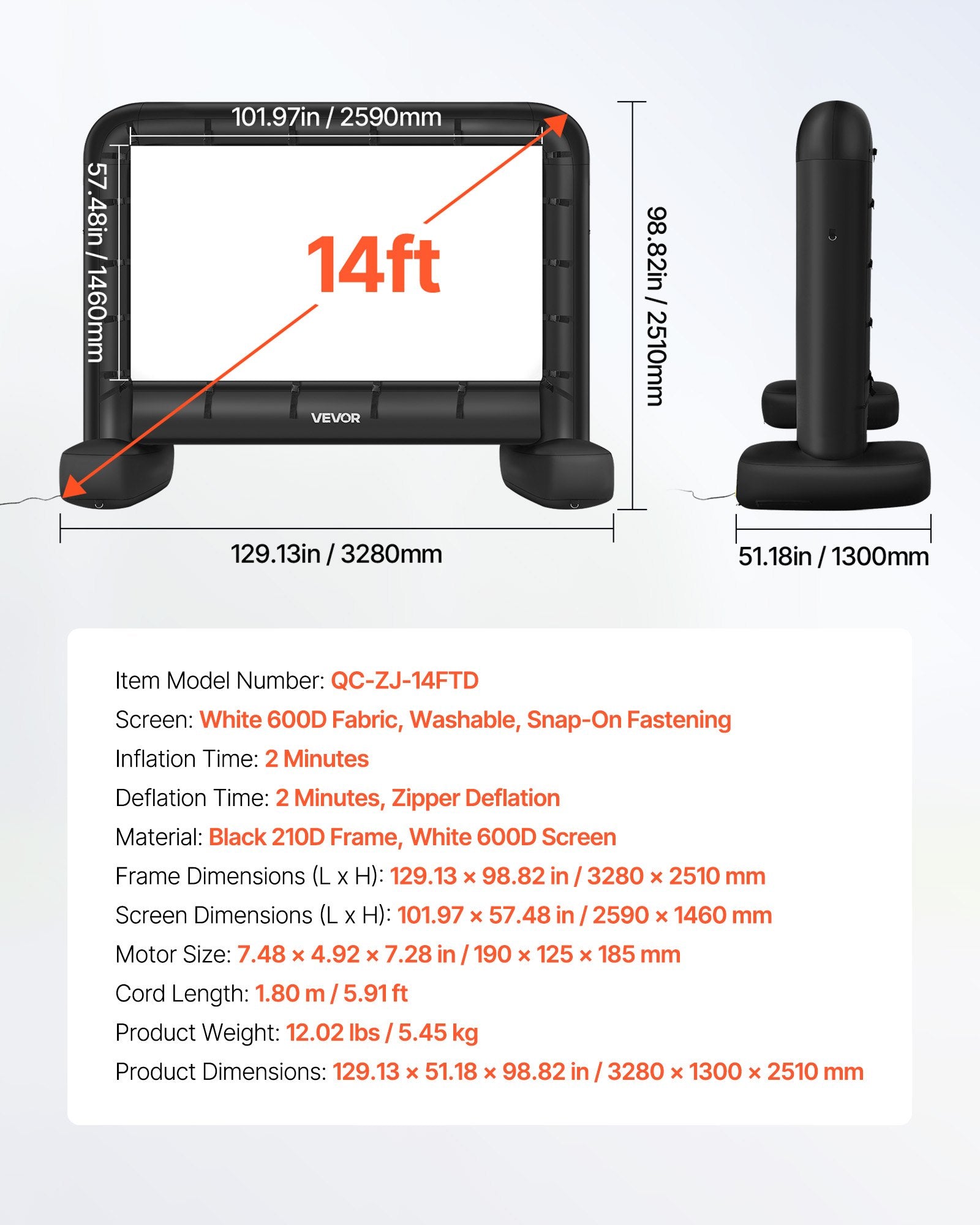 - Produktmått: 129,13 x 51,18 x 98,82 tum / 3280 x 1300 x 2510 mm