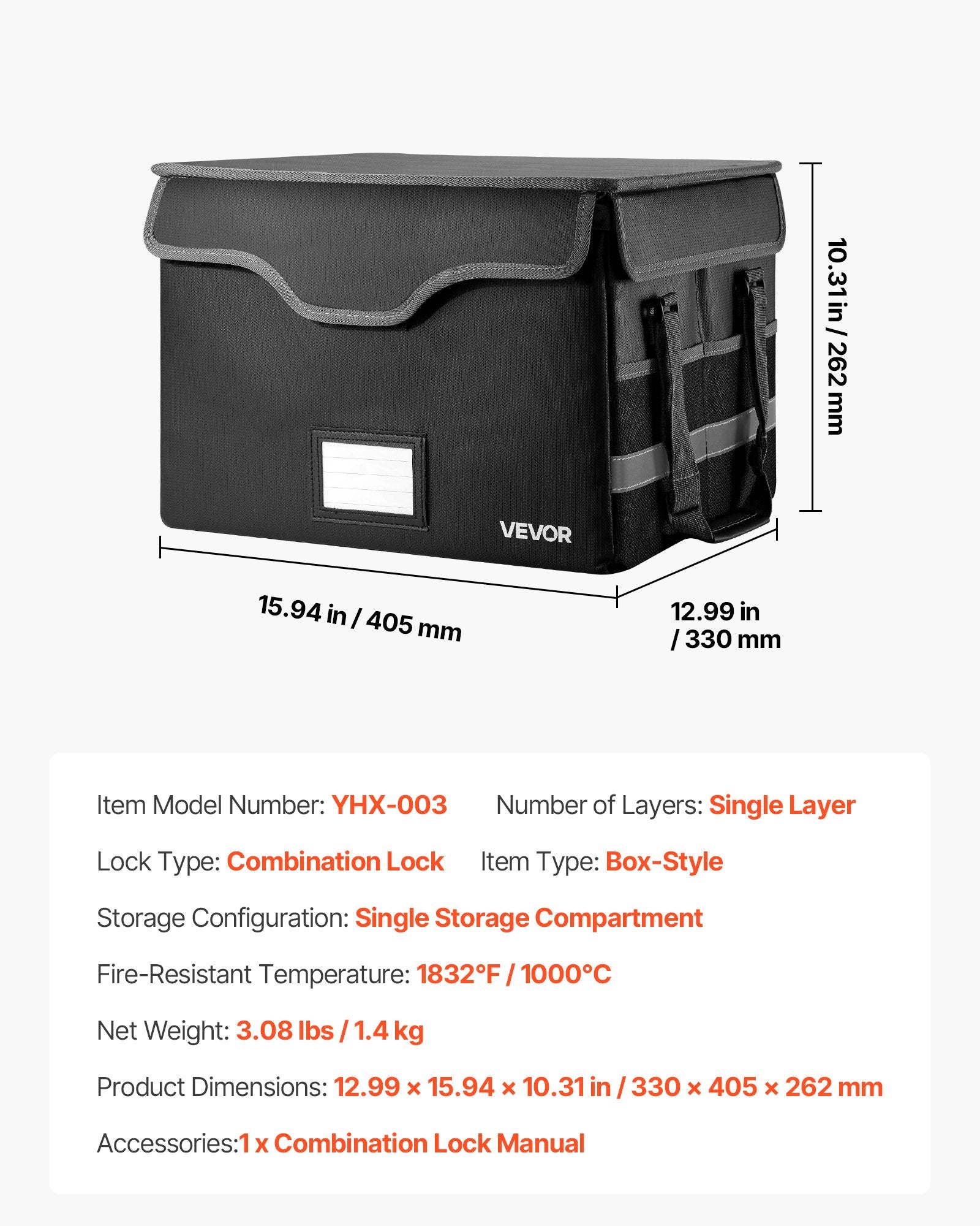 - Brandsäkert och vattentätt material: Denna brandsäkra dokumentlåda är tillverkad av värmebeständigt flamskyddsmedel och använder dammtät silikonfiberglas och polyesterfoder, vilket motstår upp till 1832℉/1000℃ och skyddar dina dokument, kontanter och värdesaker.