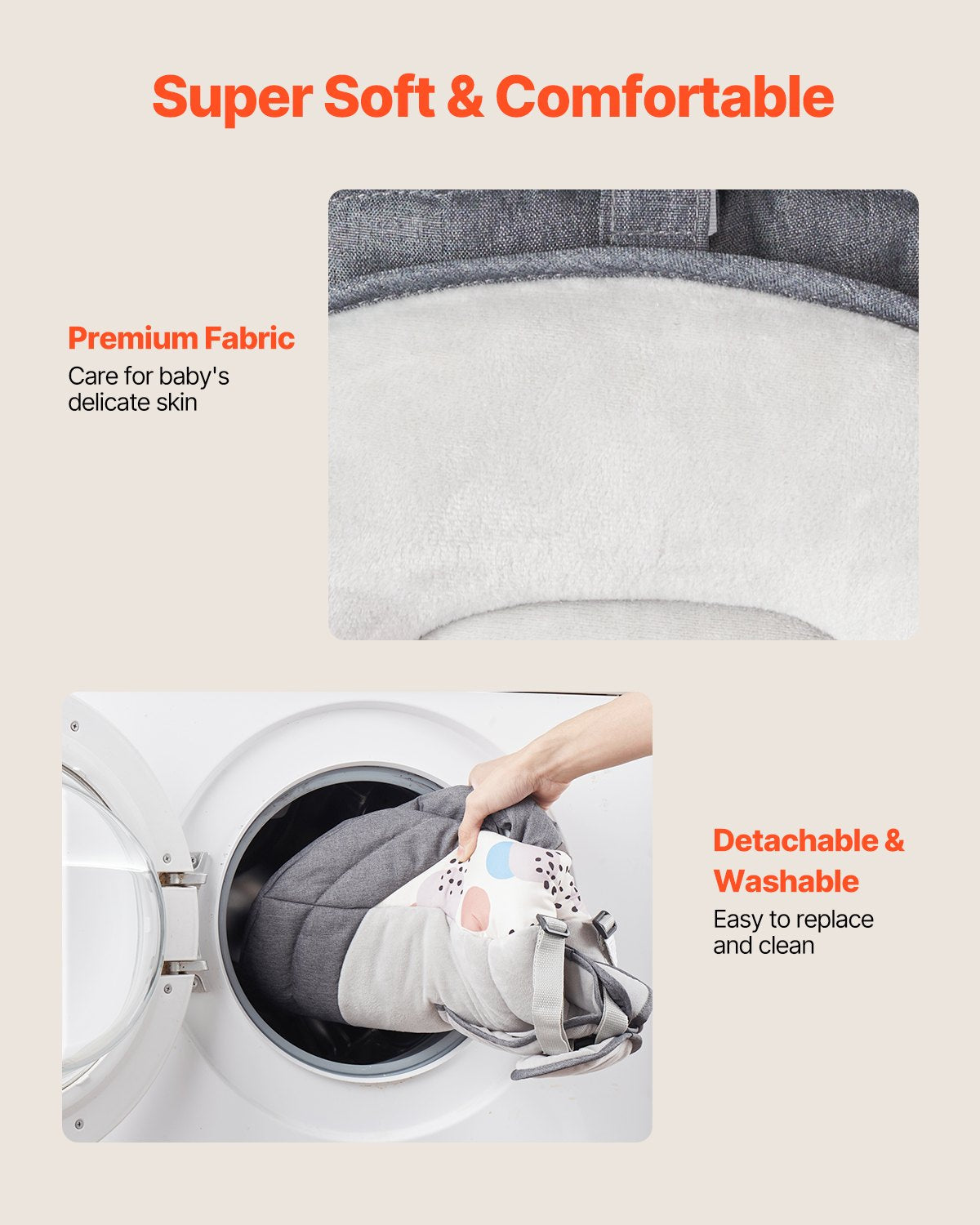 - Komfortuppgradering: Det ultramjuka kristallfleece-tyget vårdar varsamt ditt barns känsliga hud, och det bekväma U-formade huvudstödet ger perfekt komfort för ditt barns huvud. Huvudstödet är avtagbart och tvättbart, vilket gör det enkelt att hantera mjölkspill eller små olyckor – bara tvätta och återanvänd! Håll ditt barn mysigt i denna elektriska babygunga.