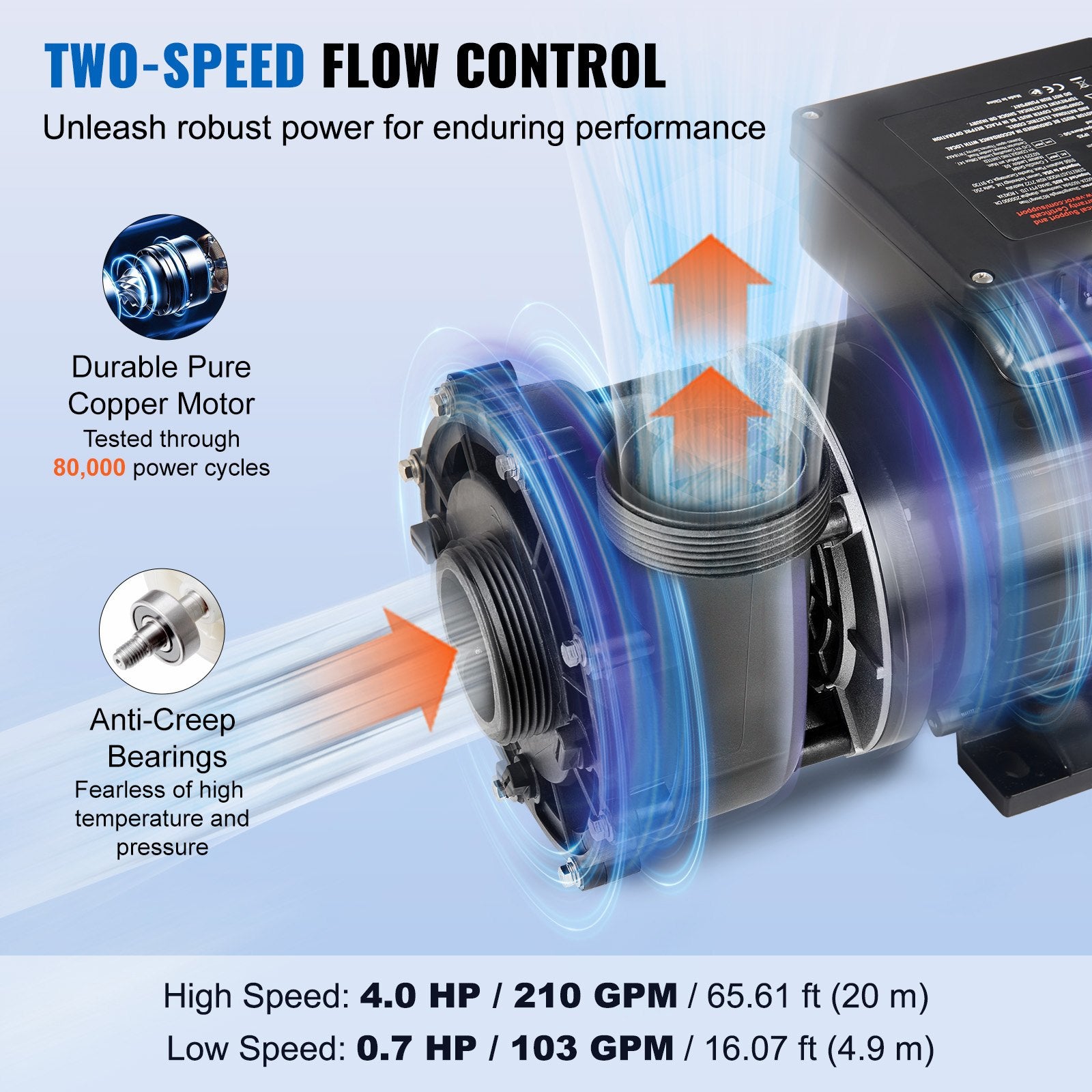 Spa-pump med 2 hastigheter, 56 ramar, spa-pump med dubbla hastigheter för bubbelpool, 1900 W / 43 m³/h / 18 m hög hastighet eller 450 W / 21,5 m³/h / 4,4 m låg hastighet, 2" port 90° rotationsgränssnitt för bubbelpool, TÜV-certifiering