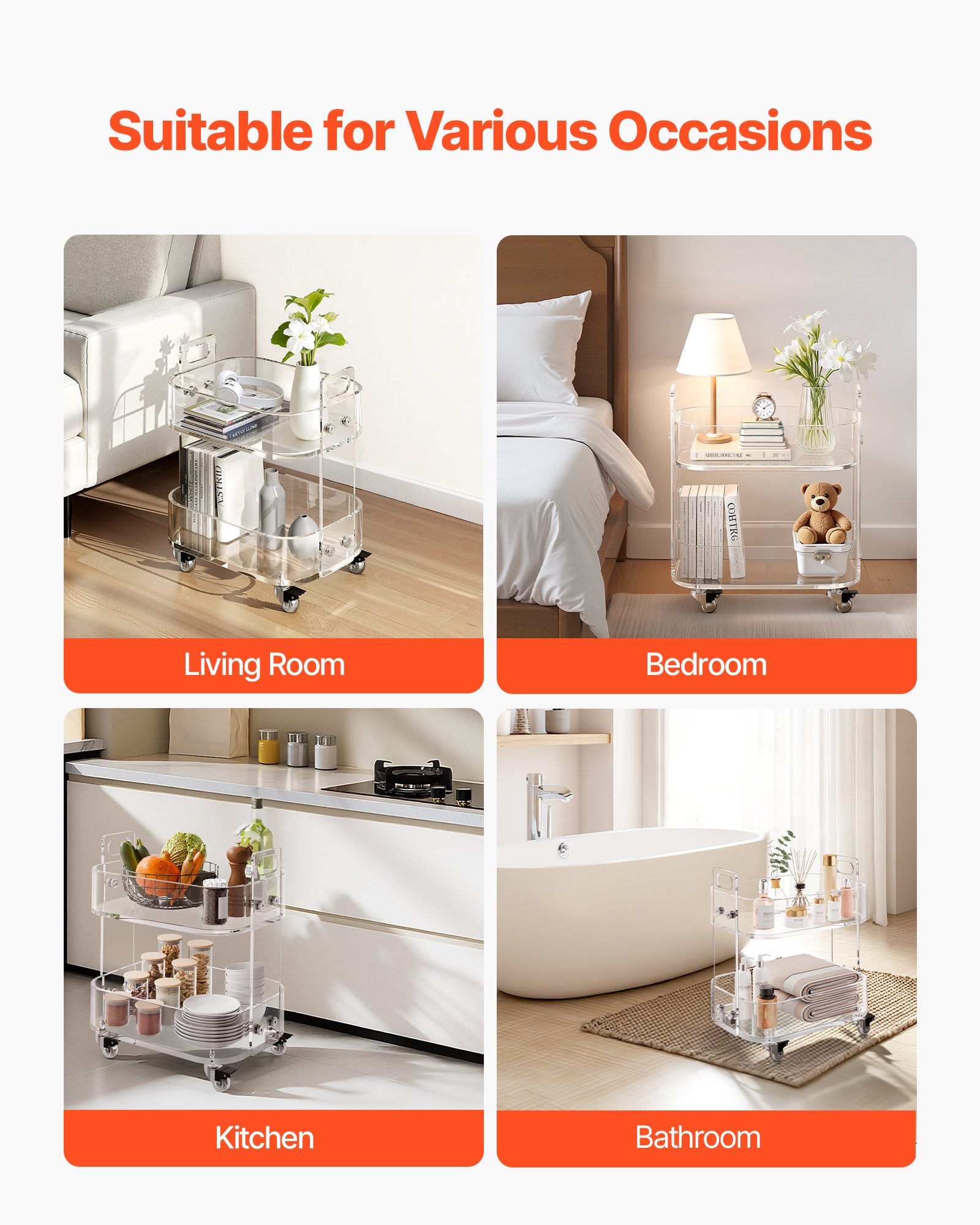 Akrylbord med hjul, mobilt vagnsbord med 2 nivåer, modernt rullande förvaringsskrivbord i akryl, genomskinligt nattduksbord, för vardagsrum, sovrum, bar, kontor, 30,5 x 41,6 x 48 cm (genomskinlig)