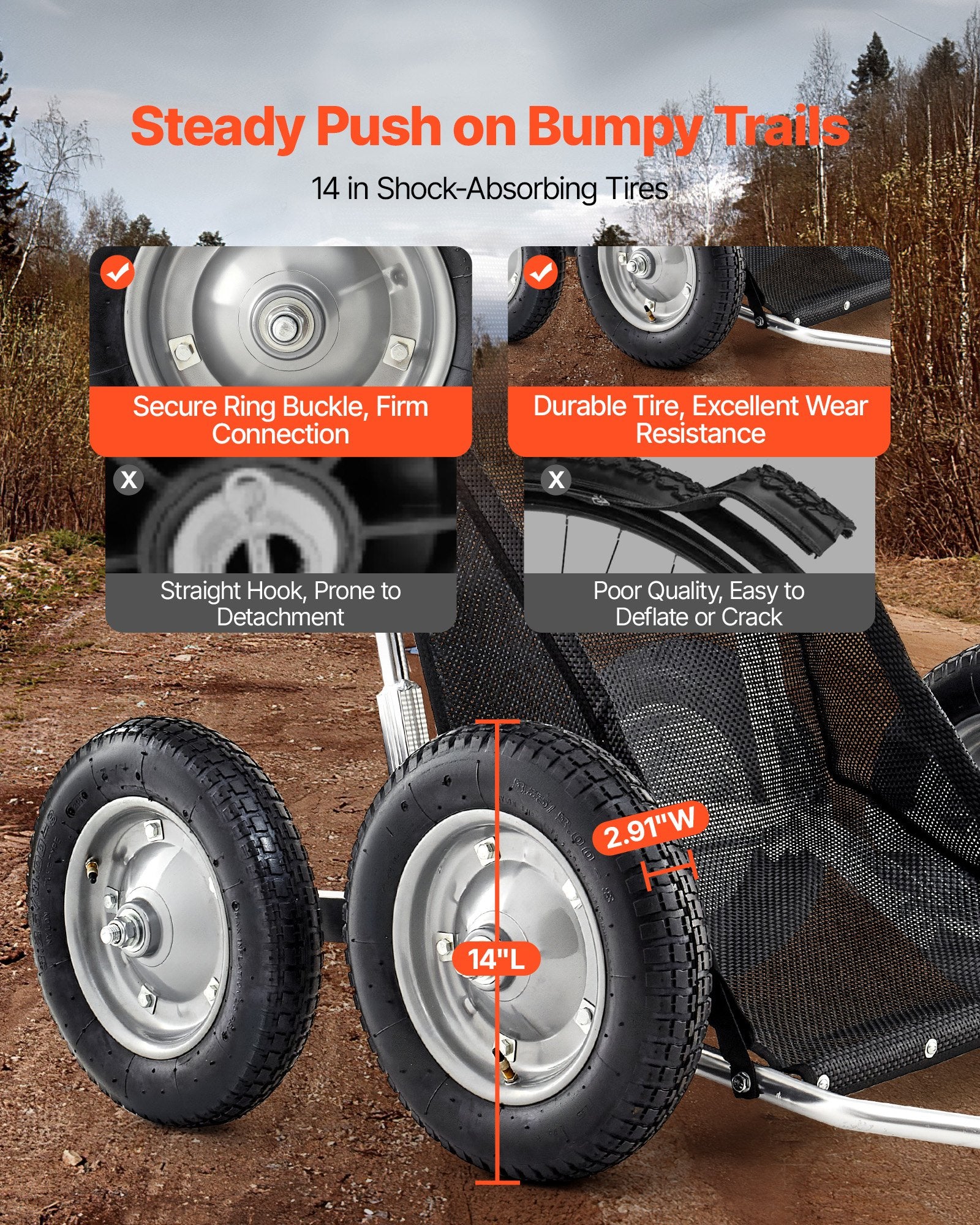 - Stötdämpande däck: Utrustad med fyra breda pneumatiska däck minimerar denna hjortvagn studs och tippning för smidig rörelse i ojämn terräng. Krokstiften använder en ringspännesdesign, vilket ger större stabilitet och lossning än raka krokar.
