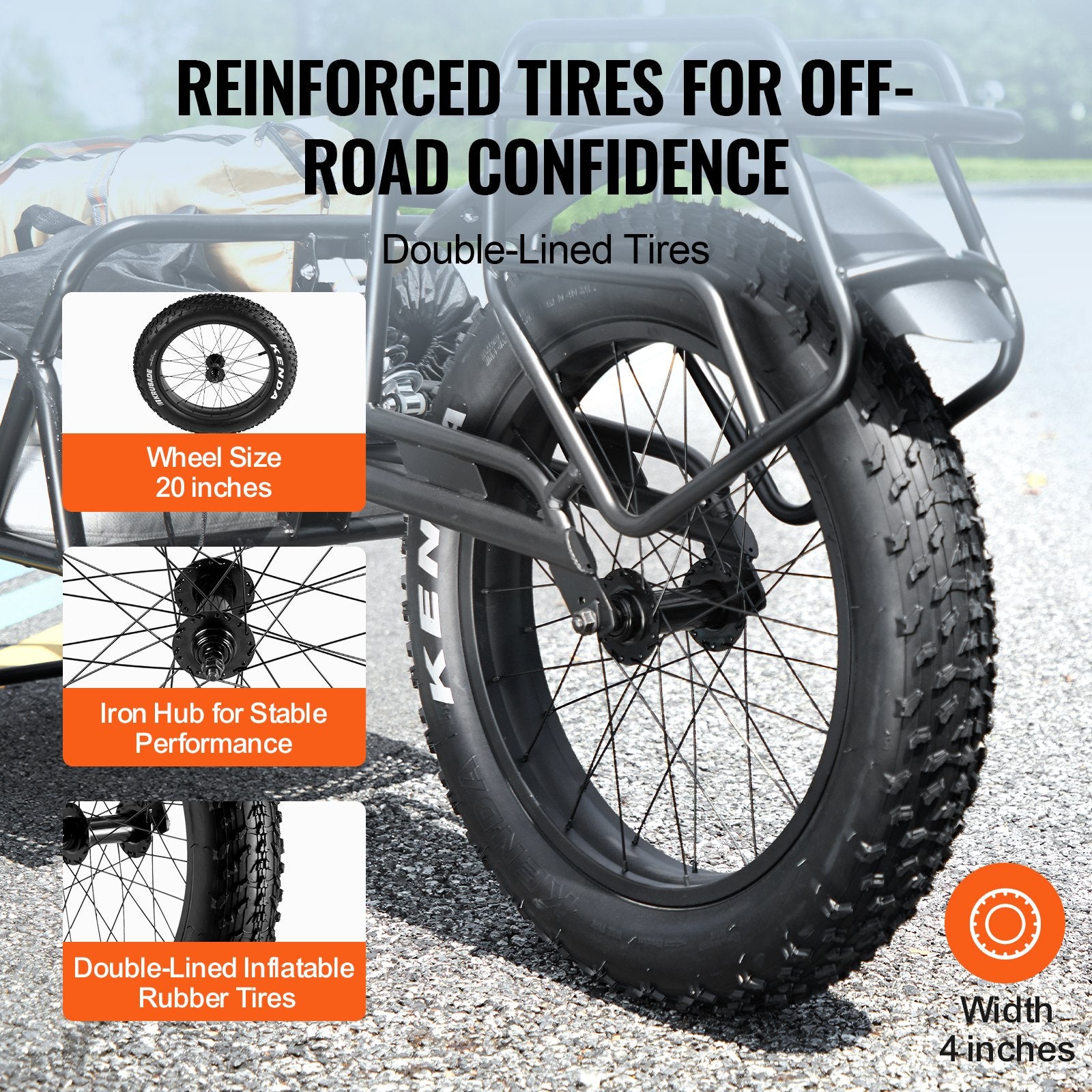 - Professional Tire Design: Our bike trailer comes equipped with a sporty 20" tire and iron hubs, providing excellent stability and traction on various surfaces, whether you're cruising on concrete, navigating gravel paths, or tackling sandy trails. The single-wheel design accommodates various narrow roads, while the spring suspension system ensures stability during mountain rides.