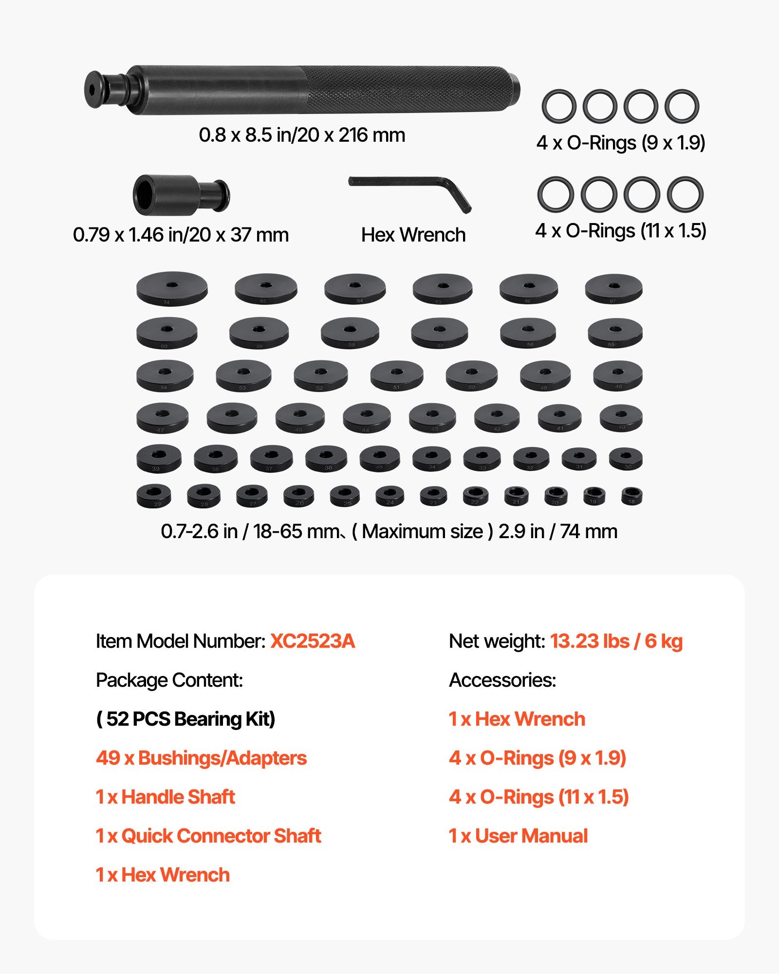 - Omfattande storlekar: Vårt lagerpresskit hanterar lagerdemonteringsuppgifter i olika storlekar. Det är utrustat med 52 vanliga skivhylsstorlekar och flera monteringstillbehör för kompletta verktyg.