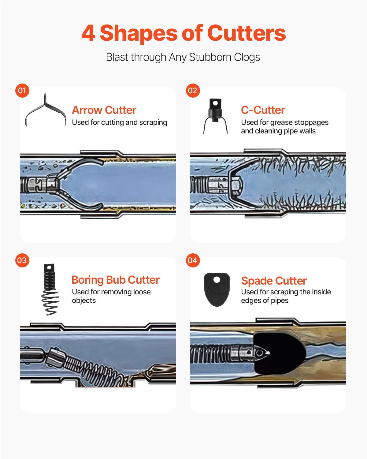- Använd överallt: VEVORs mångsidiga avloppsrensare levereras med fyra utbytbara skärare: pilskärare, spadskärare, c-skärare och bulbskärare. Den kan effektivt ta itu med stopp i rör, golvavlopp, handfat, toaletter med mera. Denna avloppsmaskin eliminerar obehagliga lukter, vilket gör den perfekt för användning i hem, fastigheter, restauranger, fabriker och skolor.