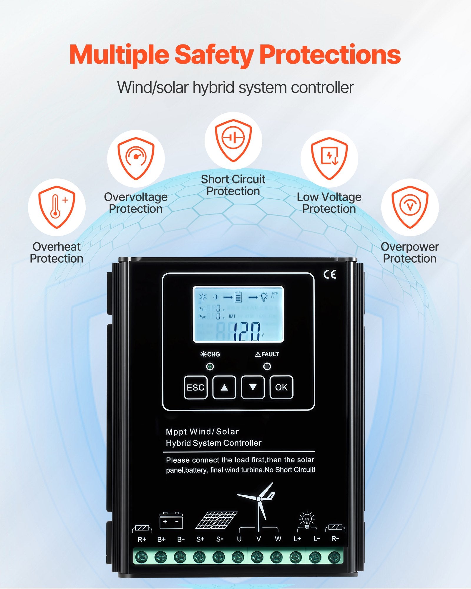 - Smart MPPT-regulator: MPPT-vind-/solhybridregulatorn hanterar effektivt både vind- och solenergi och optimerar effektomvandlingen genom maximal effektpunktsspårning. Med flera skydd för att säkerställa säker och tillförlitlig drift av off-grid-kraftsystem.