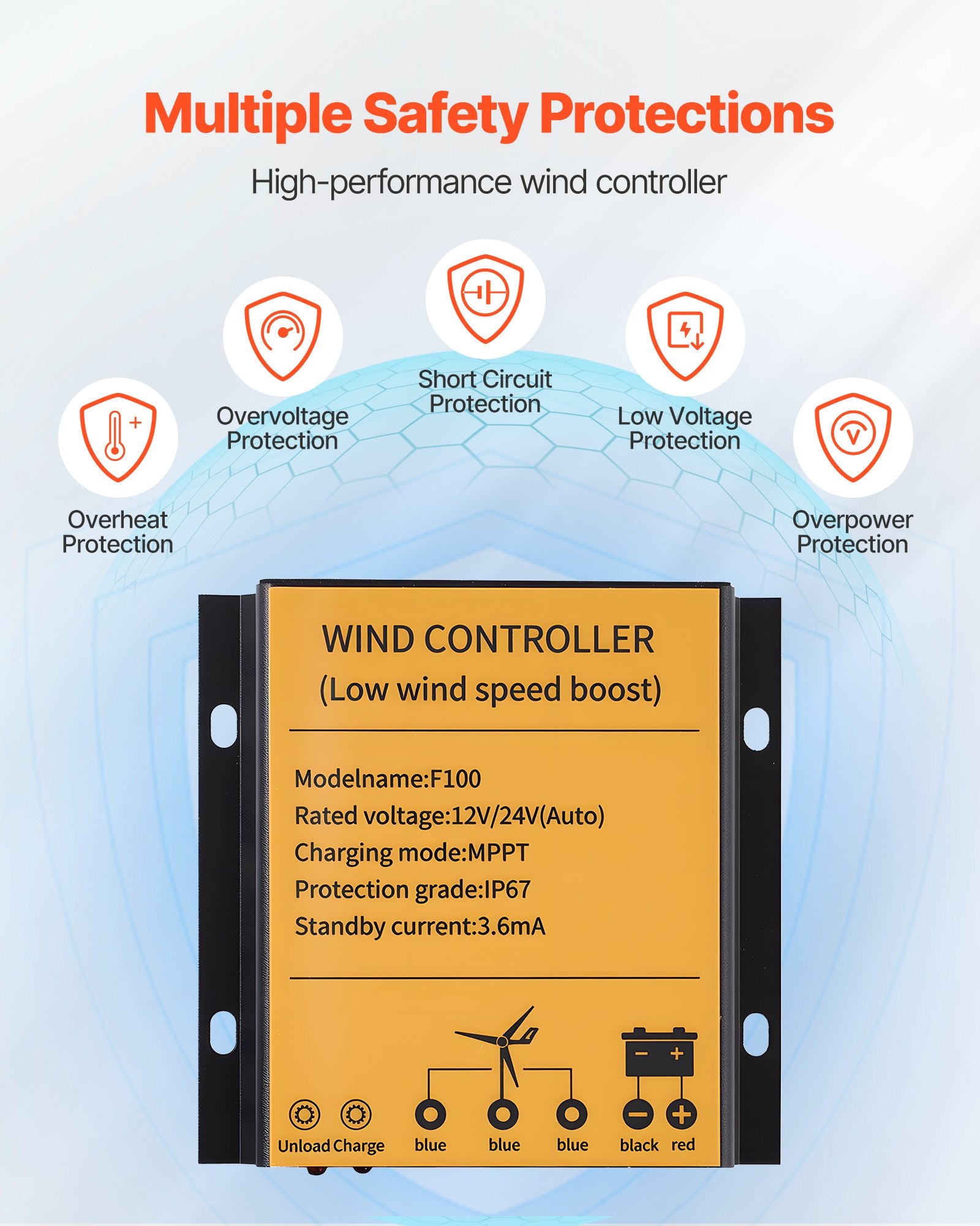 - Optimized Wind Energy Utilization: Our 3-blade wind turbine features 2.5 m/s low start-up speed, 12 m/s rated speed, 59-inch rotor diameter. Paired with the MPPT wind controller, it intelligently tracks the turbine's optimal output, maximizing energy conversion and power generation
