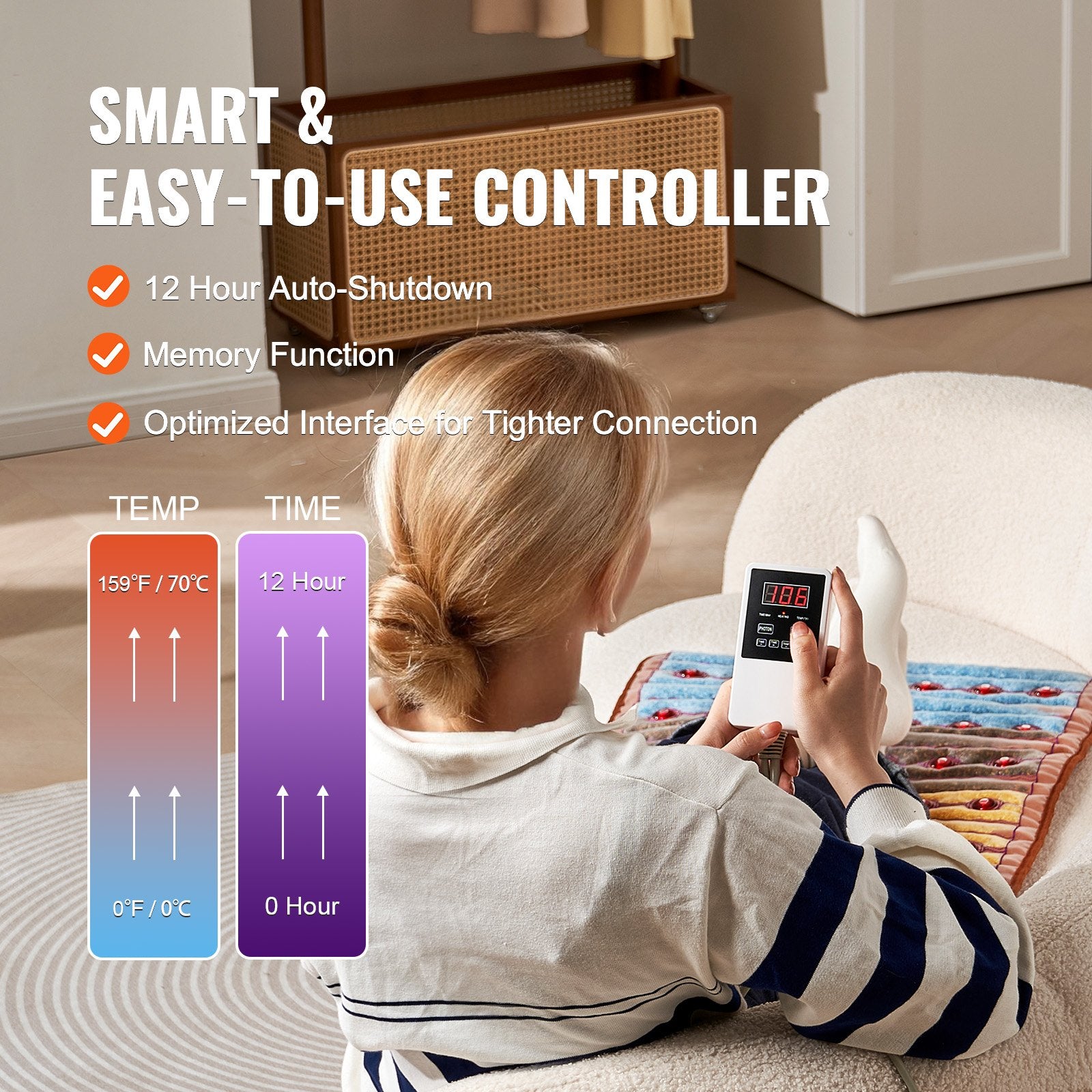 - Easy-to-Use Controller: Customize your heating experience with our user-friendly controller. Set the temperature between 103-159℉ and adjust the timer from 0 to 12 hours to suit your preferences. With a memory function, it retains your last settings, providing safe and convenient use every time.