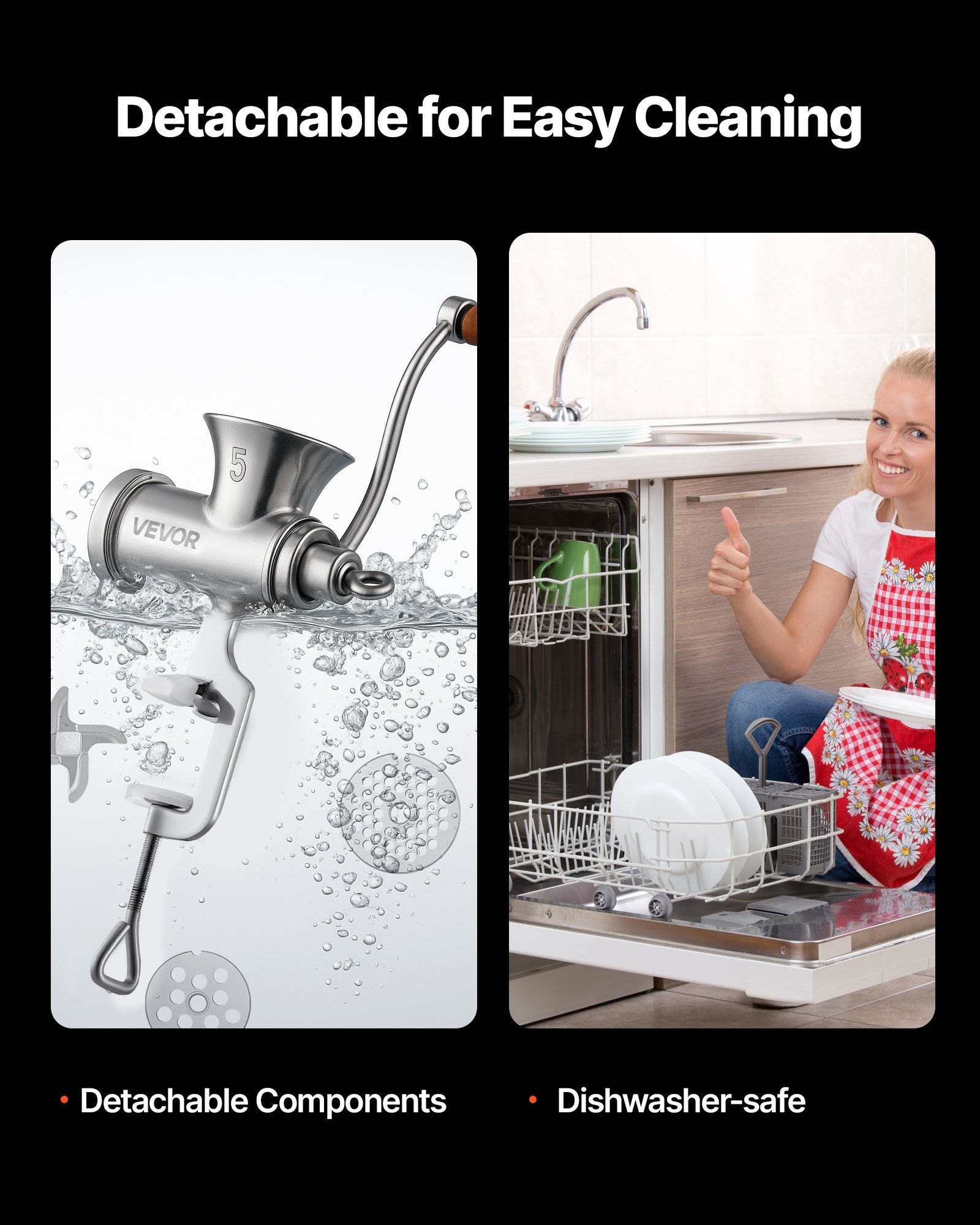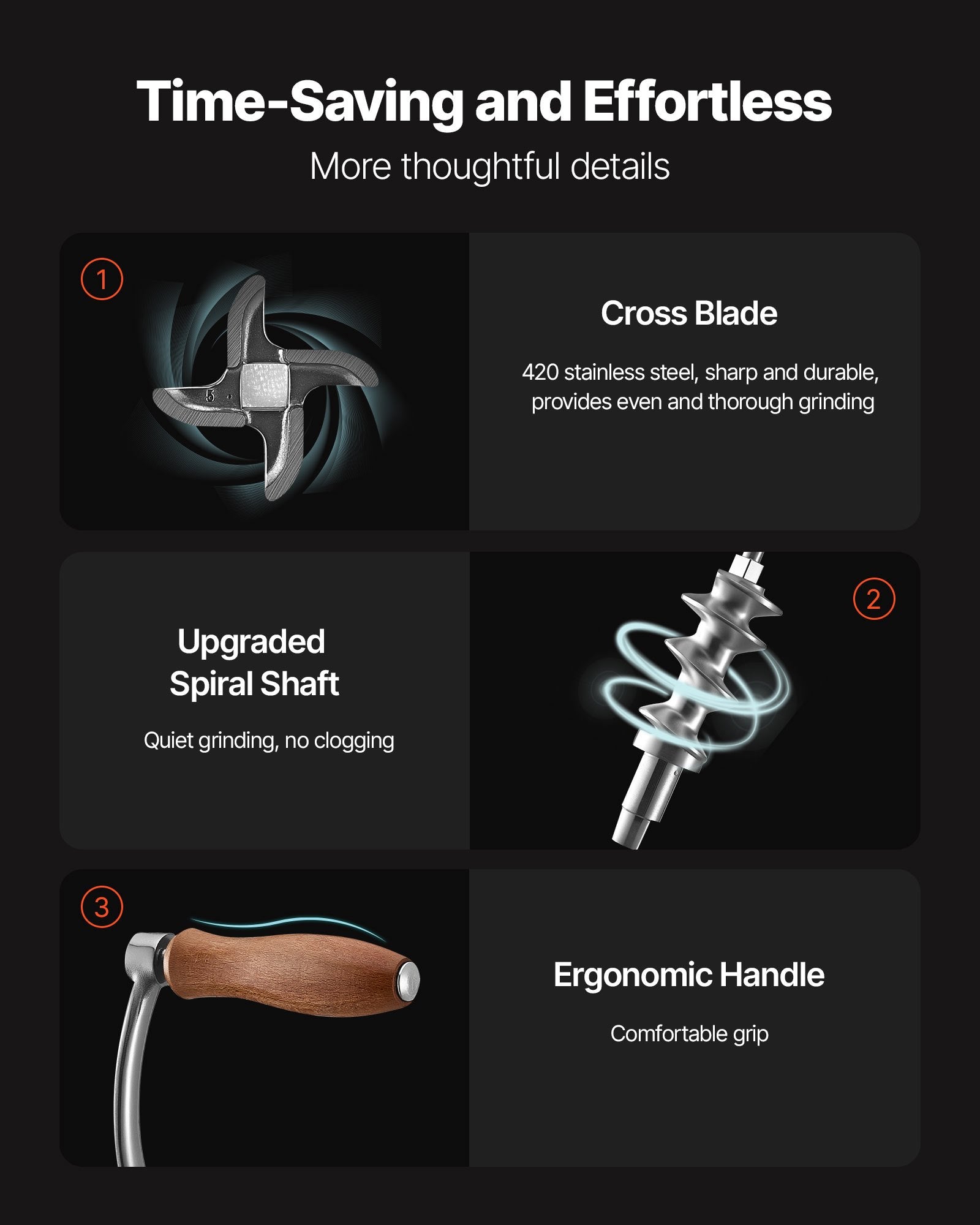 - Lätt att rengöra: Den avtagbara designen gör att alla köttkvarnens delar kan diskas i diskmaskinen, vilket gör rengöringen enkel. Torka bara torrt efter användning och förvara för ett snyggt kök. Tips: Applicera regelbundet matolja på bladet för att hålla det vasst.
