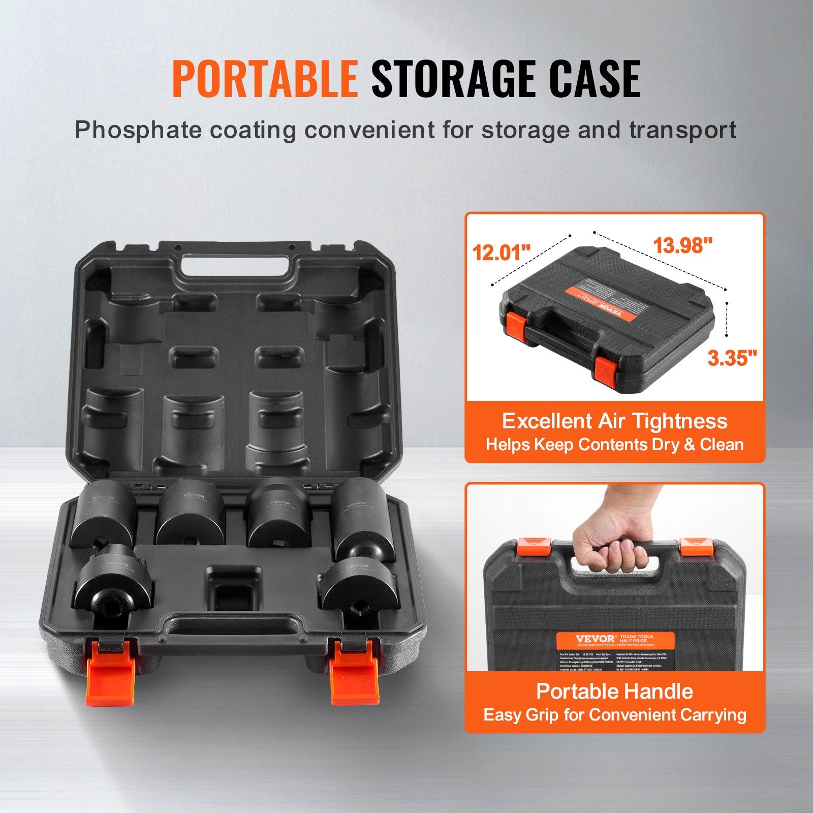 - 1/2-tums spindelmutterhylssats: Denna spindelmutterhylssats innehåller 6 olika hylsstorlekar: 2-3/4" x 4 Lug yttre, 2-5/8" x 6 Lug yttre, 2-3/8" x 4 Lug yttre, 2-1/2" x 4 Lug inner, 2-1/4" x 4 Lug inner och en framaxelavdragare. Kompatibel med en mängd olika fordon och möjliggör effektiv borttagning av hjulnavmuttrar.