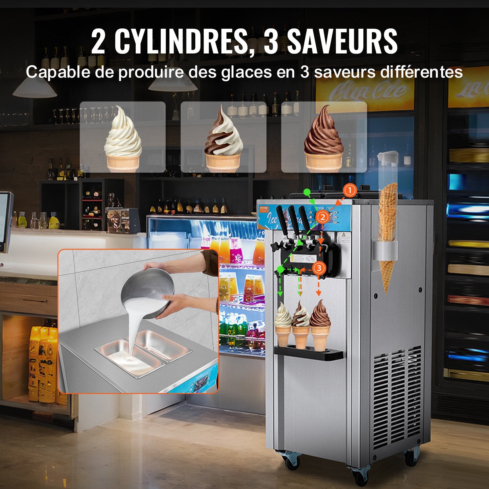 Kommersiell glassmaskin, 21–31 l/h kapacitet, 1500 W fristående mjukglassmaskin med 3 smaker, 2 x 5,5 l cylinder i rostfritt stål, LED-panel med automatisk rengöring och förkylning, för restaurangbarer