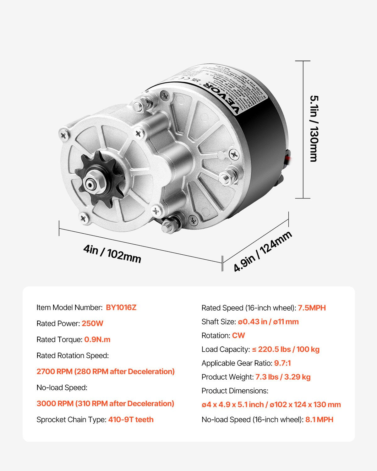 - Impressive Torque and Speed: Achieve up to 7.5 MPH at rated speed, and a no-load speed of 8.1 MPH with a 16-inch wheel, ensuring a fast and smooth ride for commuting or recreational use. The rated torque of 0.9N.m ensures reliable performance even on steep inclines and rough terrains.
