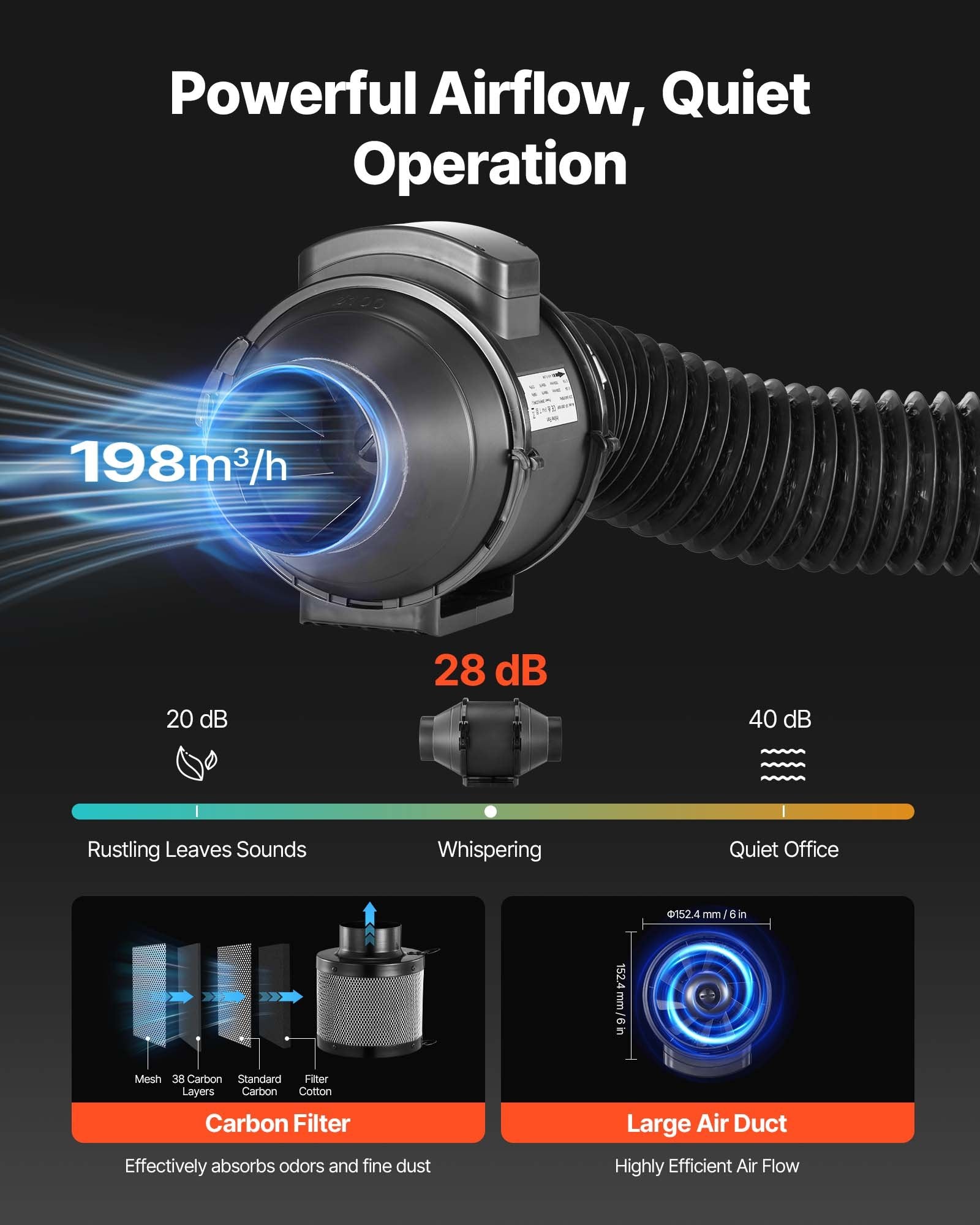 - Effektivt ventilationssystem: Med en kanalfläkt med stor diameter, ett luftflöde på 198 m³/h och låg ljudnivå. Tillsammans med ett kolfilter och ett 2 meter långt flexibelt avgasrör säkerställer vårt odlingstält för inomhusväxter korrekt ventilation, filtrerar bort damm och eliminerar lukter, vilket håller tältmiljön optimal för växthälsan.