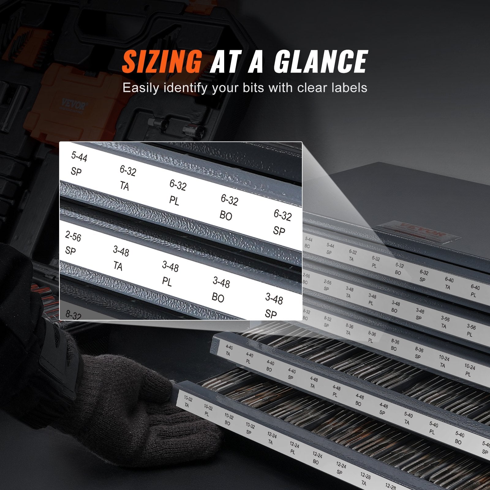 - Efficient Storage Organizer: This five-drawer, 60-compartment tap dispenser cabinet effortlessly stores your tap collection. It accommodates taps ranging in size from #2-56 to #12-28 . Labeled compartments allow for quick identification and organization.