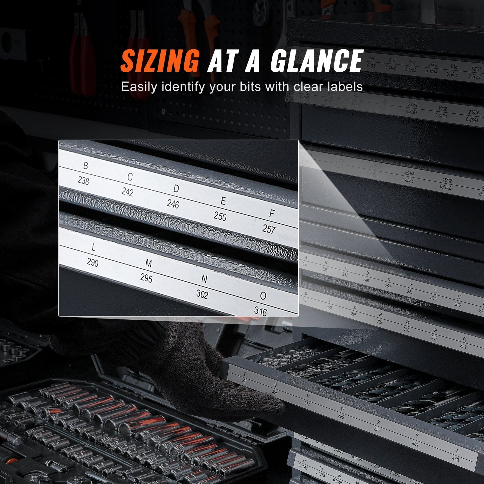 - Effektiv förvaringsorganisatör: Vårt 3-delade borrskåp förvarar enkelt din borrsamling. Det rymmer borrar i storlekar från 1/16" till 1/2", A till Ö, och #1 till #60. Märkta fack möjliggör snabb identifiering och organisering.