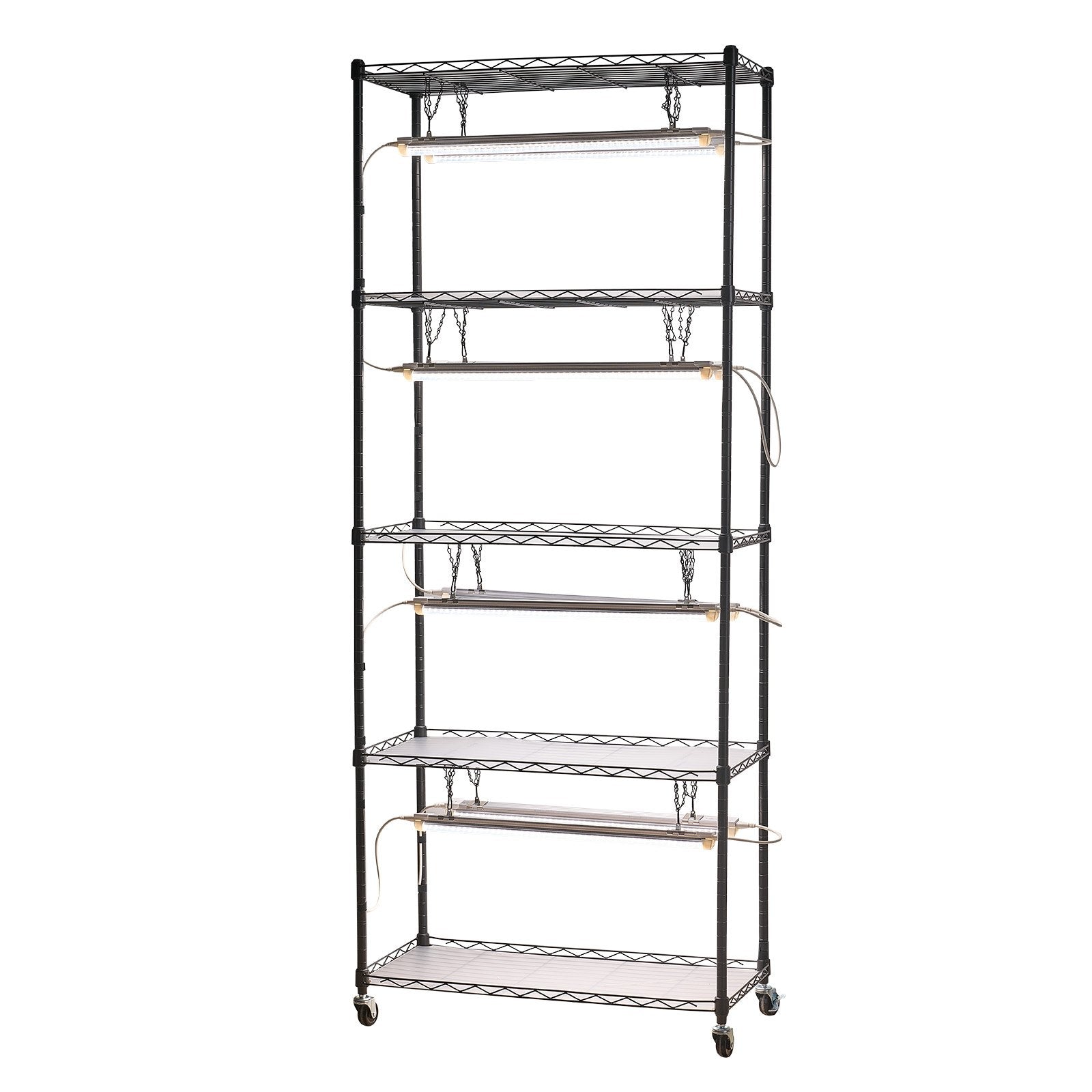 - Enkel montering och mobilitet: Växthyllan med odlingslampa inkluderar alla tillbehör för verktygsfri uppställning och demontering. Justerbar hyllhöjd passar olika växter. Utrustad med 4 kraftiga svänghjul för enkel förflyttning.
