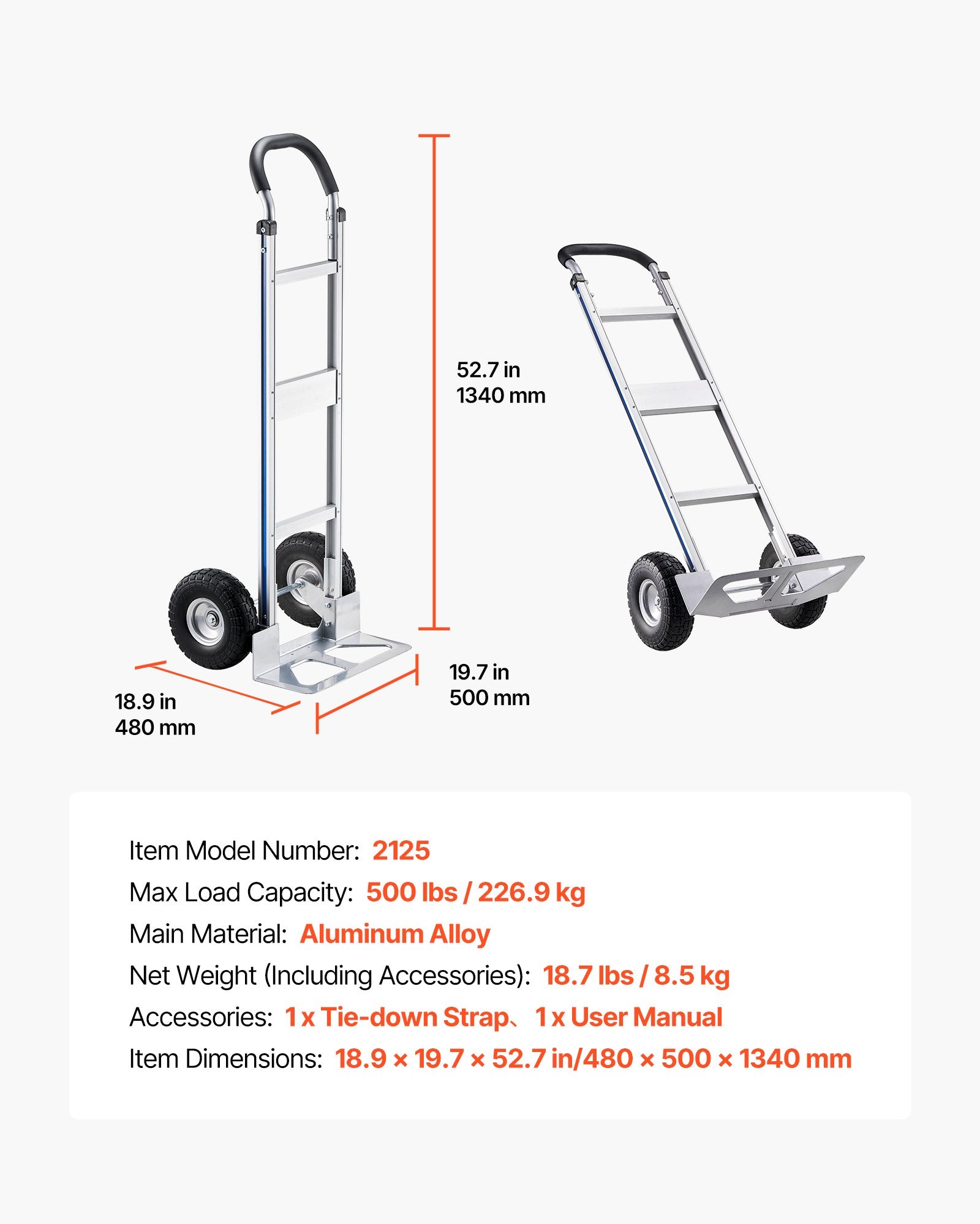 Handkärra, 226,9 kg lastkapacitet, kraftig handkärra med halkfria hjul och handtag, bärbar vagn i aluminiumlegering med surrband för flytt av hem, kontor, lager