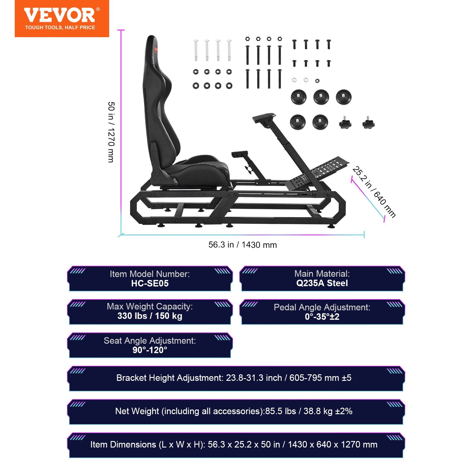 - Anpassad sittposition: Justerbar ratthöjd från 605–795 mm, universellt kompatibelt växelspaksfäste, justerbar pedalvinkel från 0° till 35°, vilket garanterar en bekväm körupplevelse oavsett om det gäller simulerade banor eller racingspel.